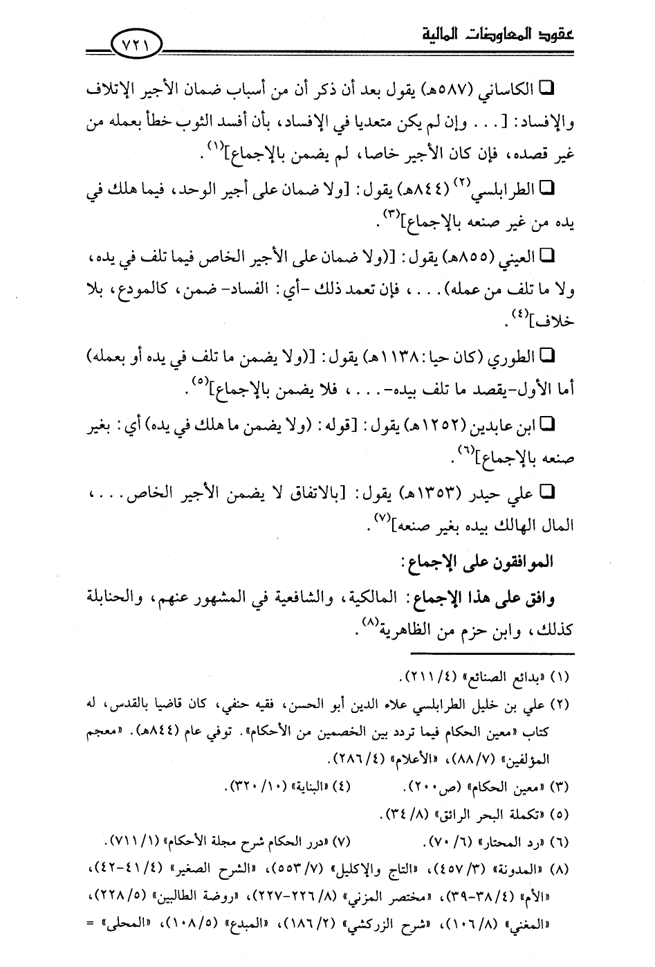 • علي حيدر (1353 هـ) يقول: [بالاتفاق لا يضمن الأجير الخاص. . .، المال الهالك بيده بغير صنعه] (¬7).