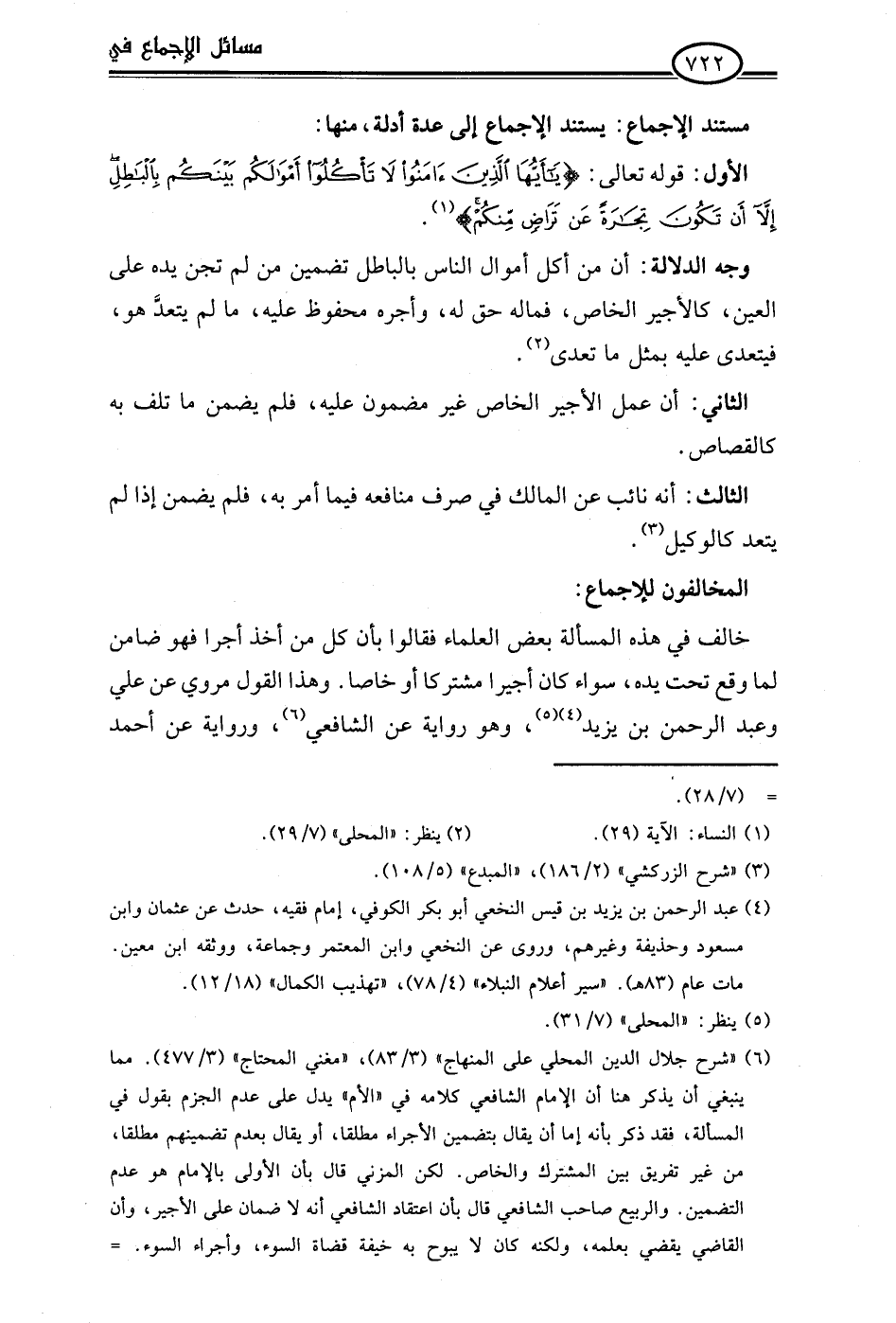 (¬6) "شرح جلال الدين المحلي على المنهاج" (3/ 83)، "مغني المحتاج" (3/ 477). مما ينبغي أن يذكر هنا أن الإمام الشافعي كلامه في "الأم" يدل على عدم الجزم بقول في المسألة، فقد ذكر بأنه إما أن يقال بتضمين الأجراء مطلقًا، أو يقال بعدم تضمينهم مطلقًا، من غير تفريق بين المشترك والخاص. لكن المزني قال بأن الأولى بالإمام هو عدم التضمين. والربيع صاحب الشافعي قال بأن اعتقاد الشافعي أنه لا ضمان على الأجير، وأن القاضي يقضي بعلمه، ولكنه كان لا يبوح به خيفة قضاة السوء، وأجراء السوء. =