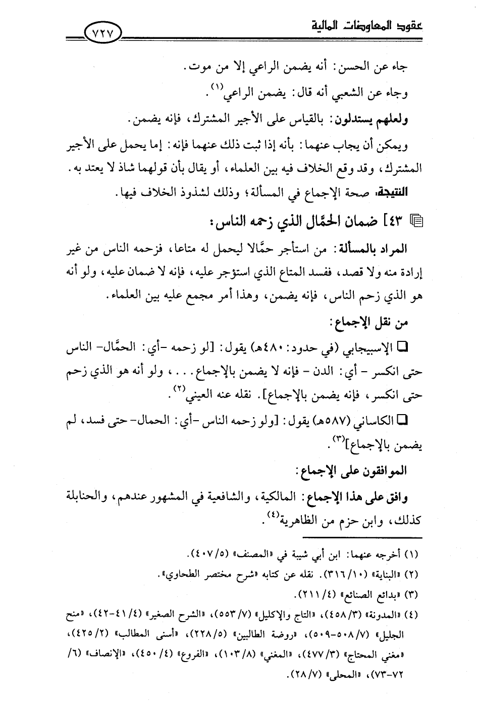 • الكاساني (587 هـ) يقول: [ولو زحمه الناس -أي: الحمال- حتى فسد، لم يضمن بالإجماع] (¬3).