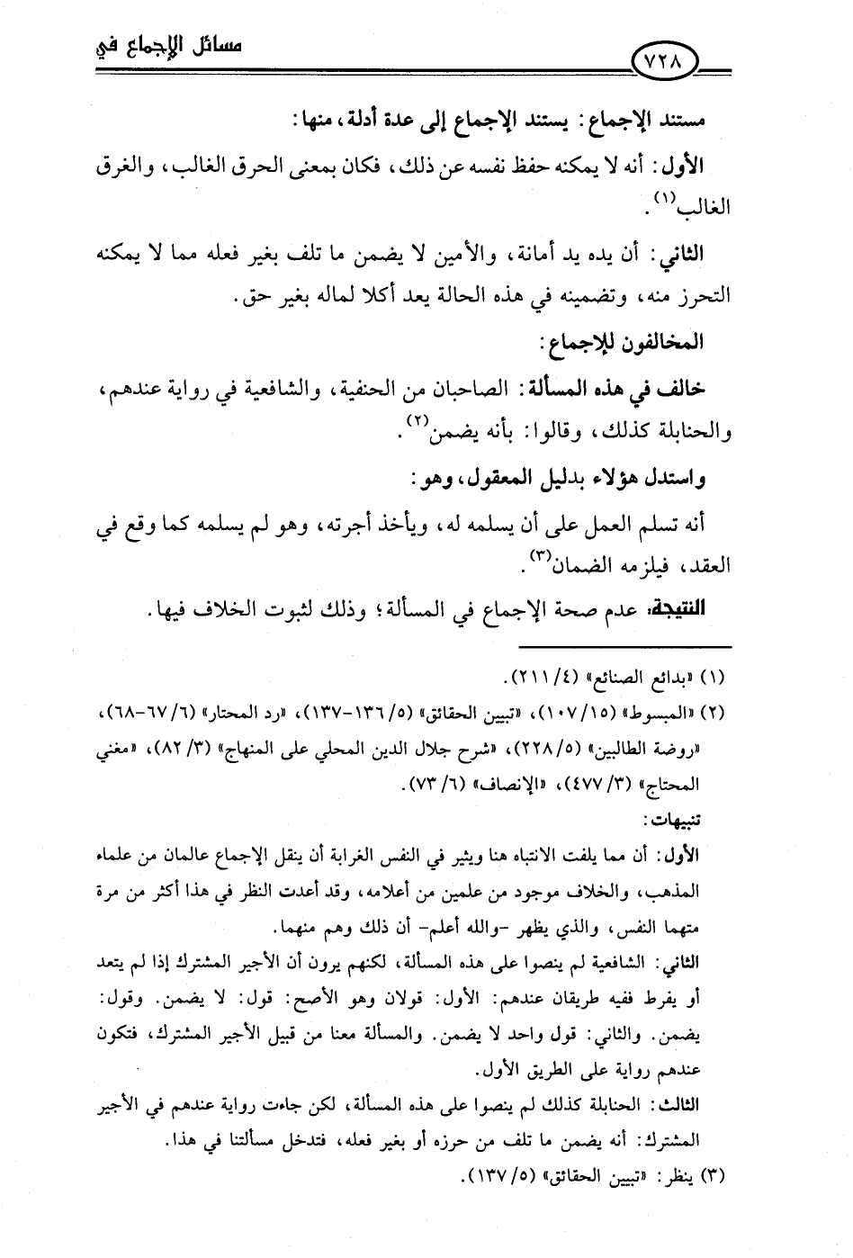 أنه تسلم العمل على أن يسلمه له، ويأخذ أجرته، وهو لم يسلمه كما وقع في العقد، فيلزمه الضمان (¬3).Rعدم صحة الإجماع في المسألة؛ وذلك لثبوت الخلاف فيها.