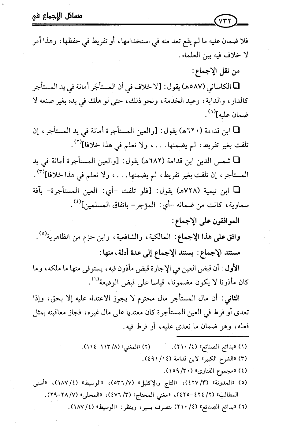 • ابن قدامة (620 هـ) يقول: [والعين المستأجرة أمانة في يد المستأجر، إن تلفت بغير تفريط، لم يضمنها. . .، ولا نعلم في هذا خلافا] (¬2).