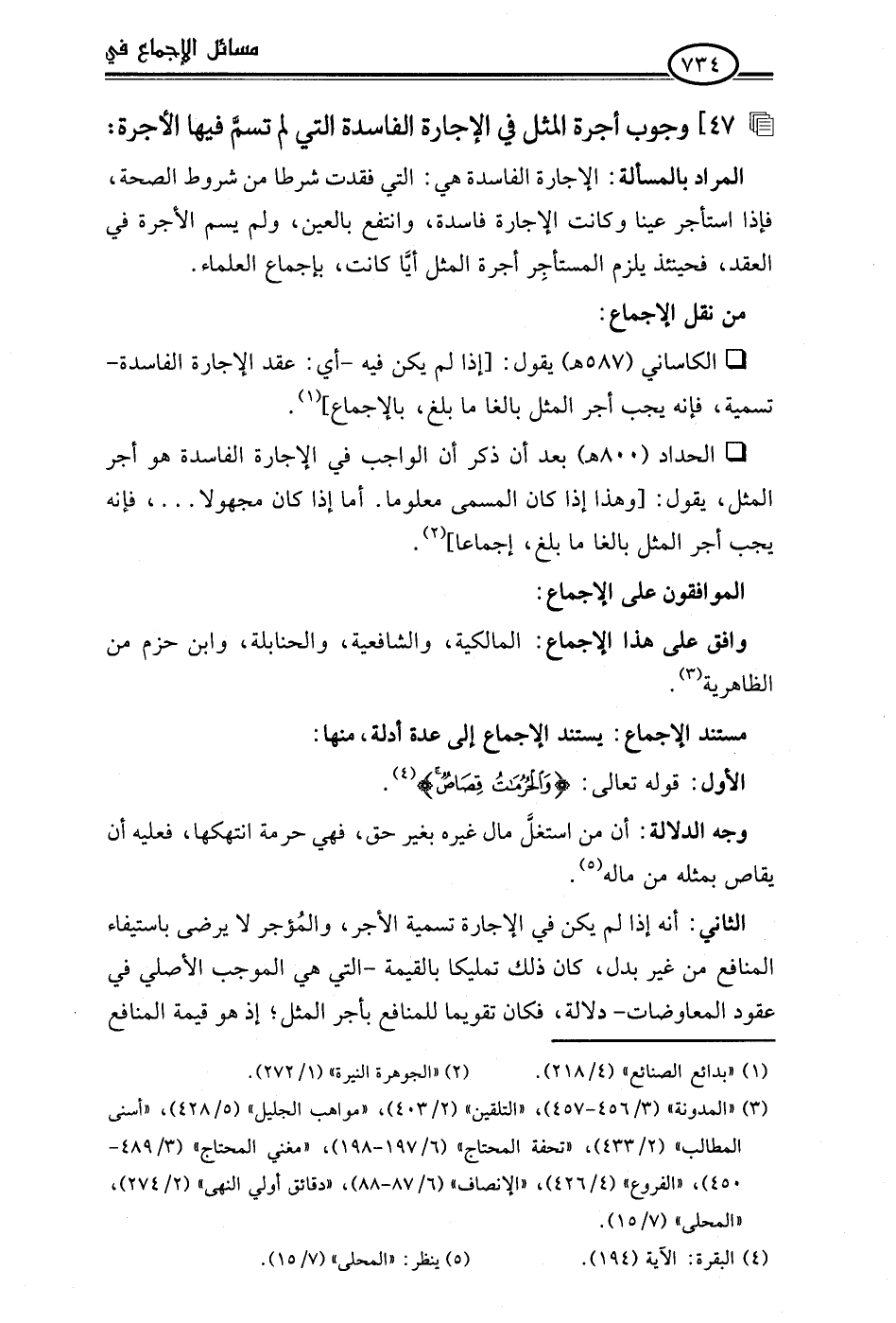 • الكاساني (587 هـ) يقول: [إذا لم يكن فيه -أي: عقد الإجارة الفاسدة- تسمية، فإنه يجب أجر المثل بالغا ما بلغ، بالإجماع] (¬1).
