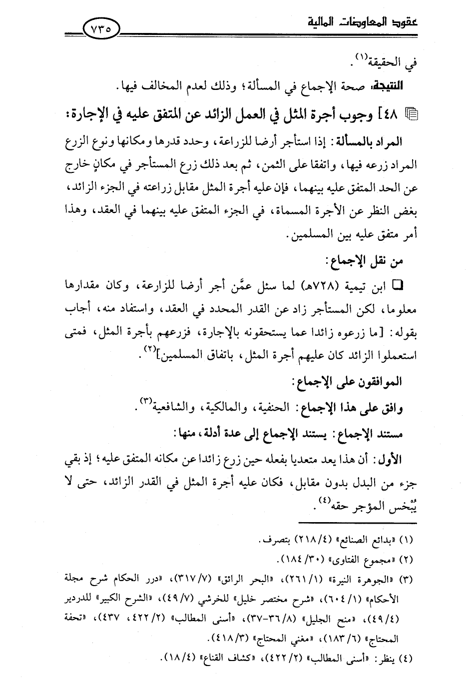 • ابن تيمية (728 هـ) لما سئل عمَّن أجر أرضا للزراعة، وكان مقدارها معلوما، لكن المستأجر زاد عن القدر المحدد في العقد، واستفاد منه، أجاب بقوله: [ما زرعوه زائدا عما يستحقونه بالإجارة، فزرعهم بأجرة المثل، فمتى استعملوا الزائد كان عليهم أجرة المثل، باتفاق المسلمين] (¬2).