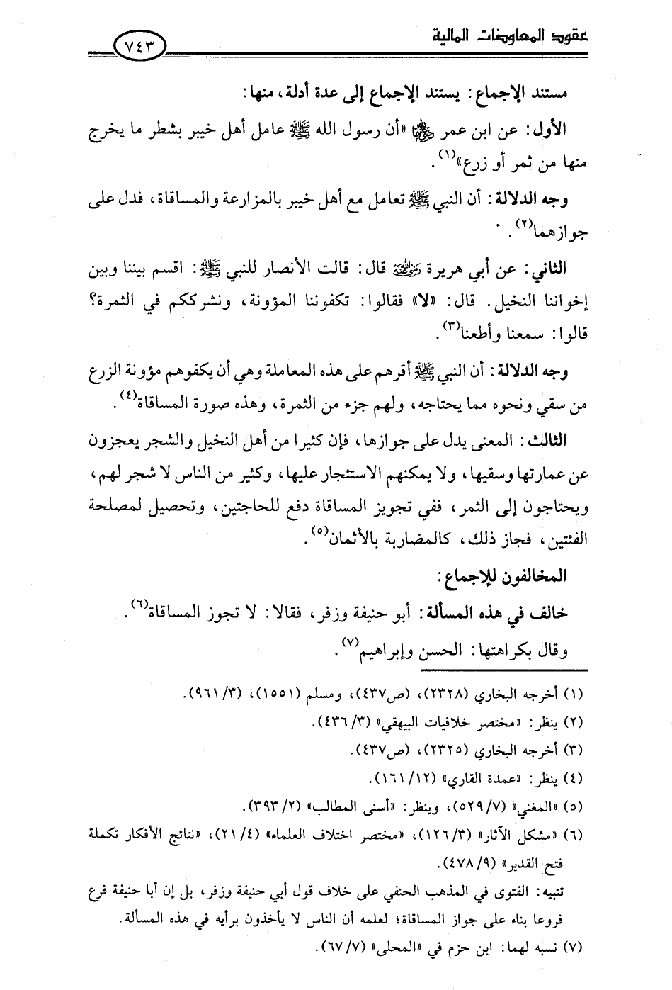 تنبيه: الفتوى في المذهب الحنفي على خلاف قول أبي حنيفة وزفر، بل إن أبا حنيفة فرع فروعا بناء على جواز المساقاة؛ لعلمه أن الناس لا يأخذون برأيه في هذه المسألة.