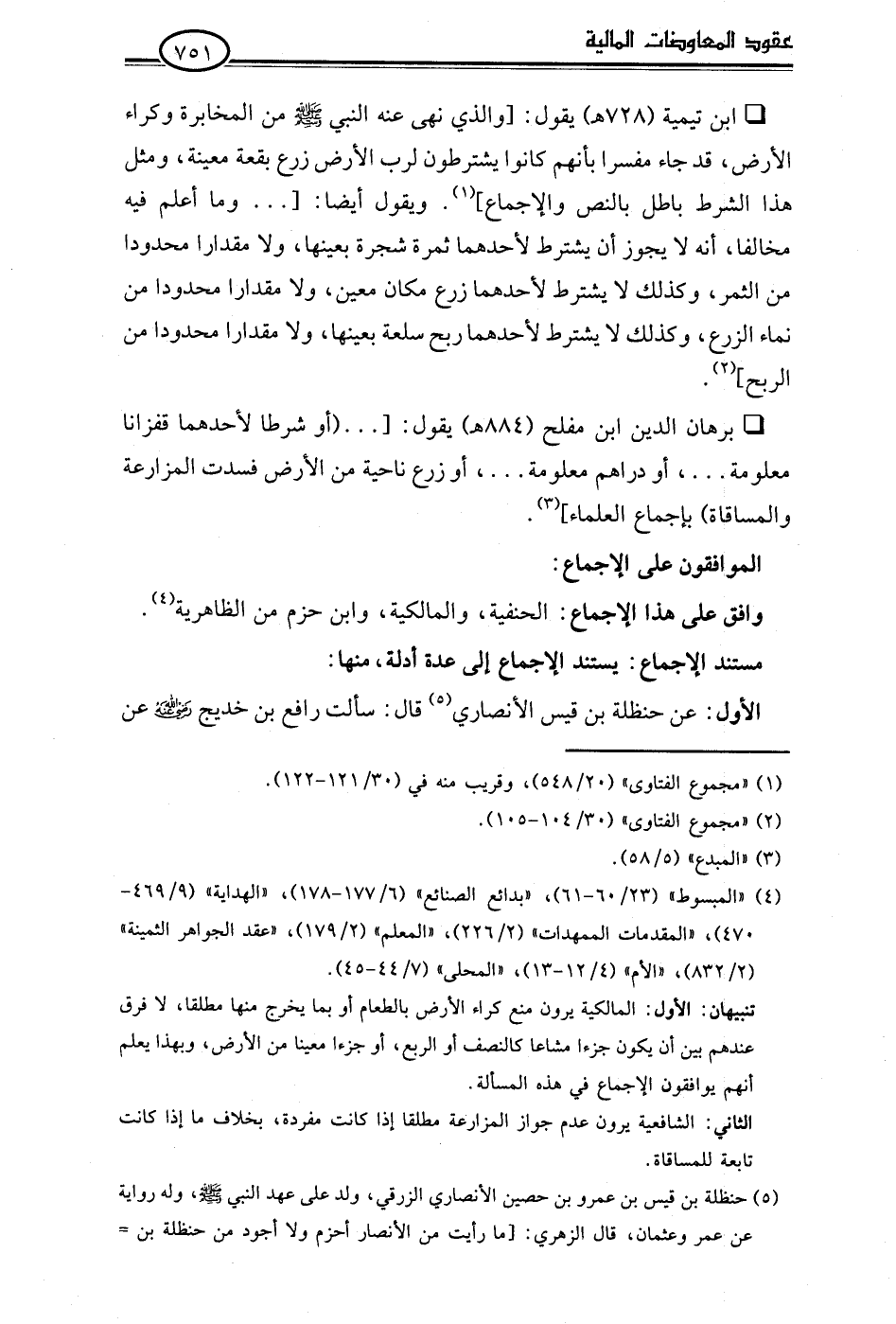 • ابن تيمية (728 هـ) يقول: [والذي نهى عنه النبي -صلى اللَّه عليه وسلم- من المخابرة وكراء الأرض، قد جاء مفسرا بأنهم كانوا يشترطون لرب الأرض زرع بقعة معينة، ومثل هذا الشرط باطل بالنص والإجماع] (¬1). ويقول أيضًا: [. . . وما أعلم فيه مخالفا، أنه لا يجوز أن يشترط لأحدهما ثمرة شجرة بعينها، ولا مقدارا محدودا من الثمر، وكذلك لا يشترط لأحدهما زرع مكان معين، ولا مقدارا محدودا من نماء الزرع، وكذلك لا يشترط لأحدهما ربح سلعة بعينها، ولا مقدارا محدودا من الربح] (¬2).