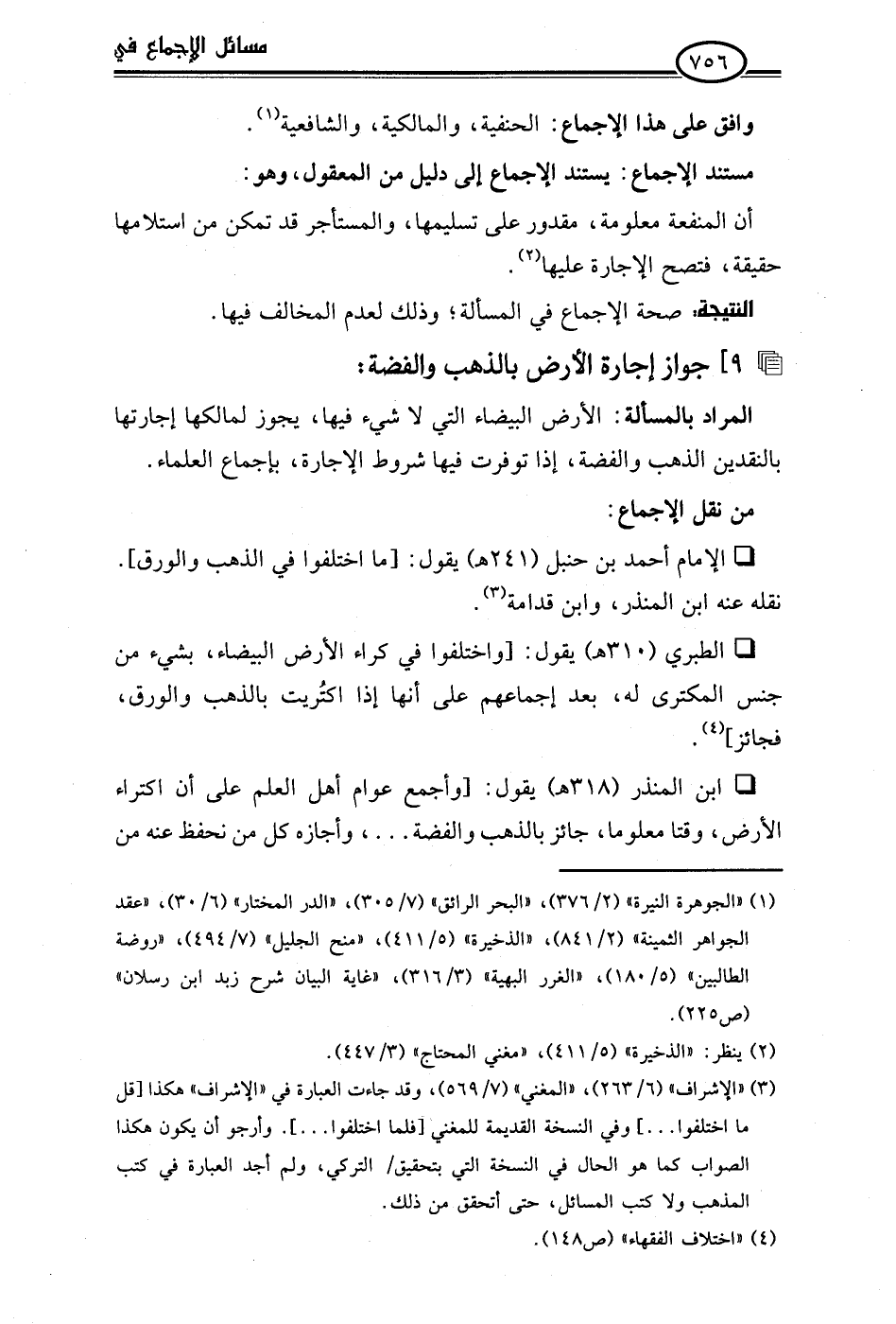 • ابن المنذر (318 هـ) يقول: [وأجمع عوام أهل العلم على أن اكتراء الأرض، وقتا معلوما، جائز بالذهب والفضة. . .، وأجازه كل من نحفظ عنه من