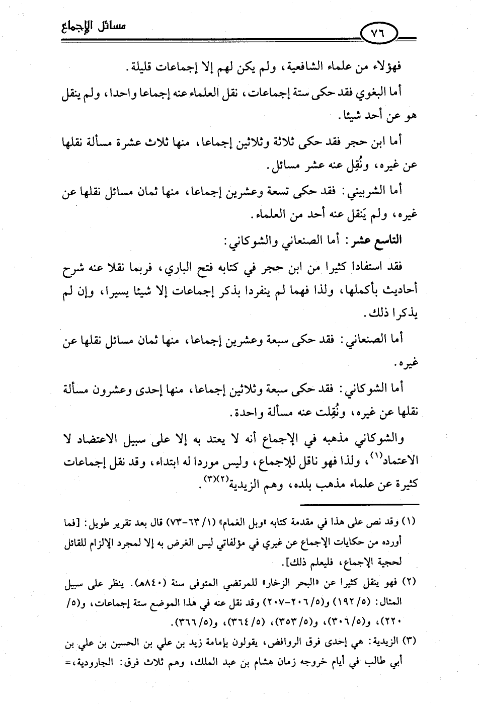 (¬1) وقد نص على هذا في مقدمة كتابه "وبل الغمام" (1/ 63 - 73) قال بعد تقرير طويل: [فما أورده من حكايات الإجماع عن غيري في مؤلفاتي ليس الغرض به إلا لمجرد الإلزام للقائل لحجية الإجماع، فليعلم ذلك].
