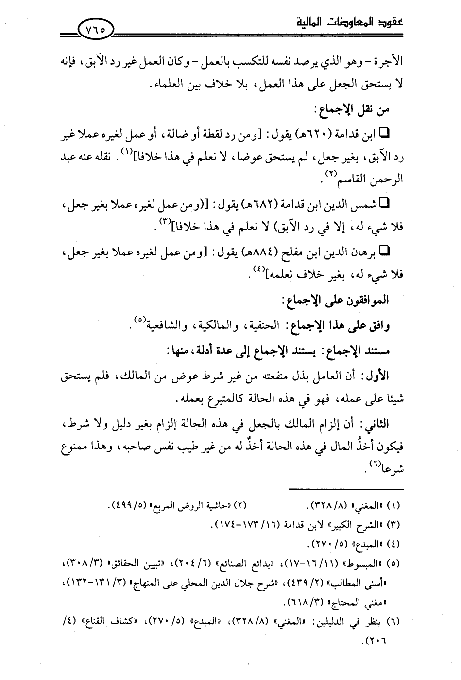• برهان الدين ابن مفلح (884 هـ) يقول: [ومن عمل لغيره عملا بغير جعل، فلا شيء له، بغير خلاف نعلمه] (¬4).
