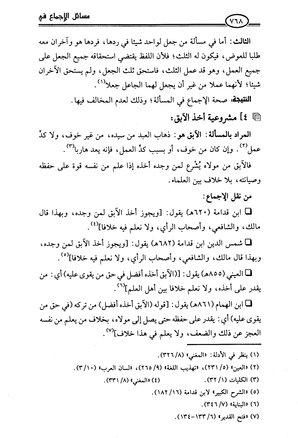 • ابن قدامة (620 هـ) يقول: [ويجوز أخذ الآبق لمن وجده، وبهذا قال مالك، والشافعي، وأصحاب الرأي، ولا نعلم فيه خلافا] (¬4).