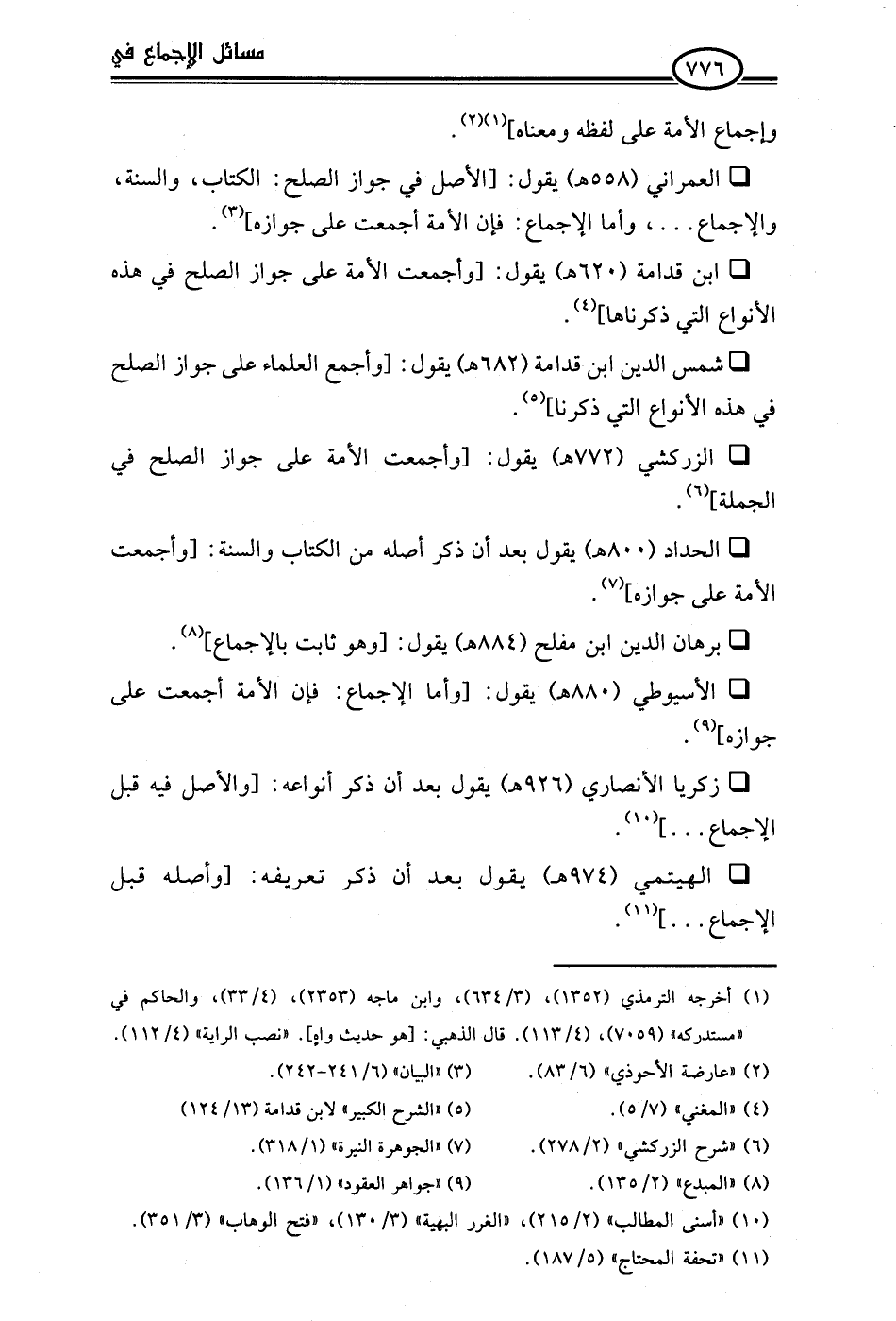 • الزركشي (772 هـ) يقول: [وأجمعت الأمة على جواز الصلح في الجملة] (¬6).