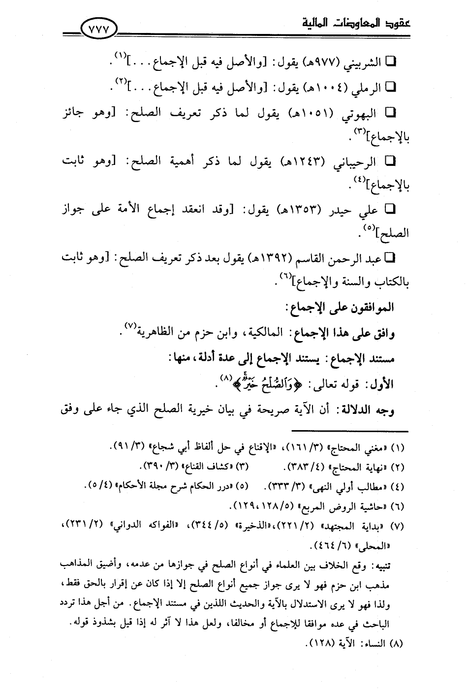 • الرحيباني (1243 هـ) يقول لما ذكر أهمية الصلح: [وهو ثابت بالإجماع] (¬4).