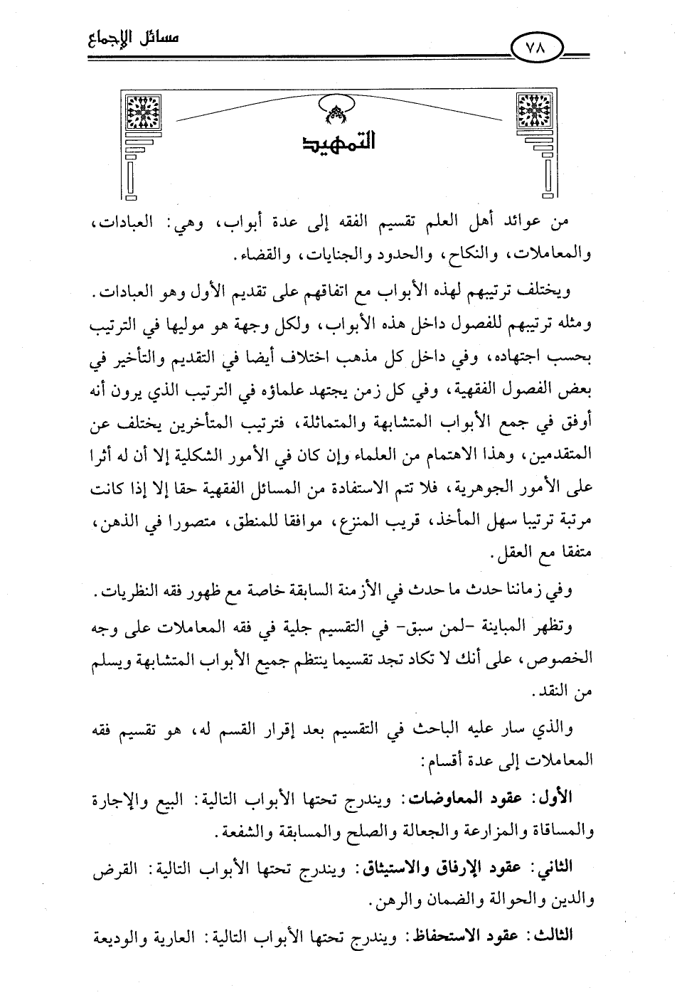 من عوائد أهل العلم تقسيم الفقه إلى عدة أبواب، وهي: العبادات، والمعاملات، والنكاح، والحدود والجنايات، والقضاء.