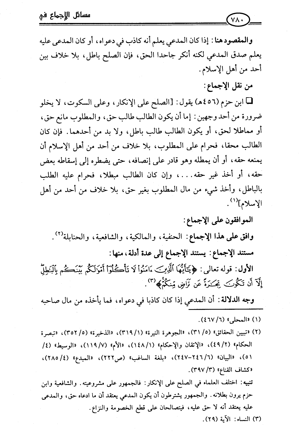 • ابن حزم (456 هـ) يقول: [الصلح على الإنكار، وعلى السكوت، لا يخلو ضرورة من أحد وجهين: إما أن يكون الطالب طالب حق، والمطلوب مانع حق، أو مماطلا لحق، أو يكون الطالب طالب باطل، ولا بد من أحدهما. فإن كان الطالب محقا، فحرام على المطلوب، بلا خلاف من أحد من أهل الإسلام أن يمنعه حقه، أو أن يمطله وهو قادر على إنصافه، حتى يضطره إلى إسقاطه بعض حقه، أو أخذ غير حقه. . .، وإن كان الطالب مبطلا، فحرام عليه الطلب بالباطل، وأخذ شيء من مال المطلوب بغير حق، بلا خلاف من أحد من أهل الإسلام] (¬1).