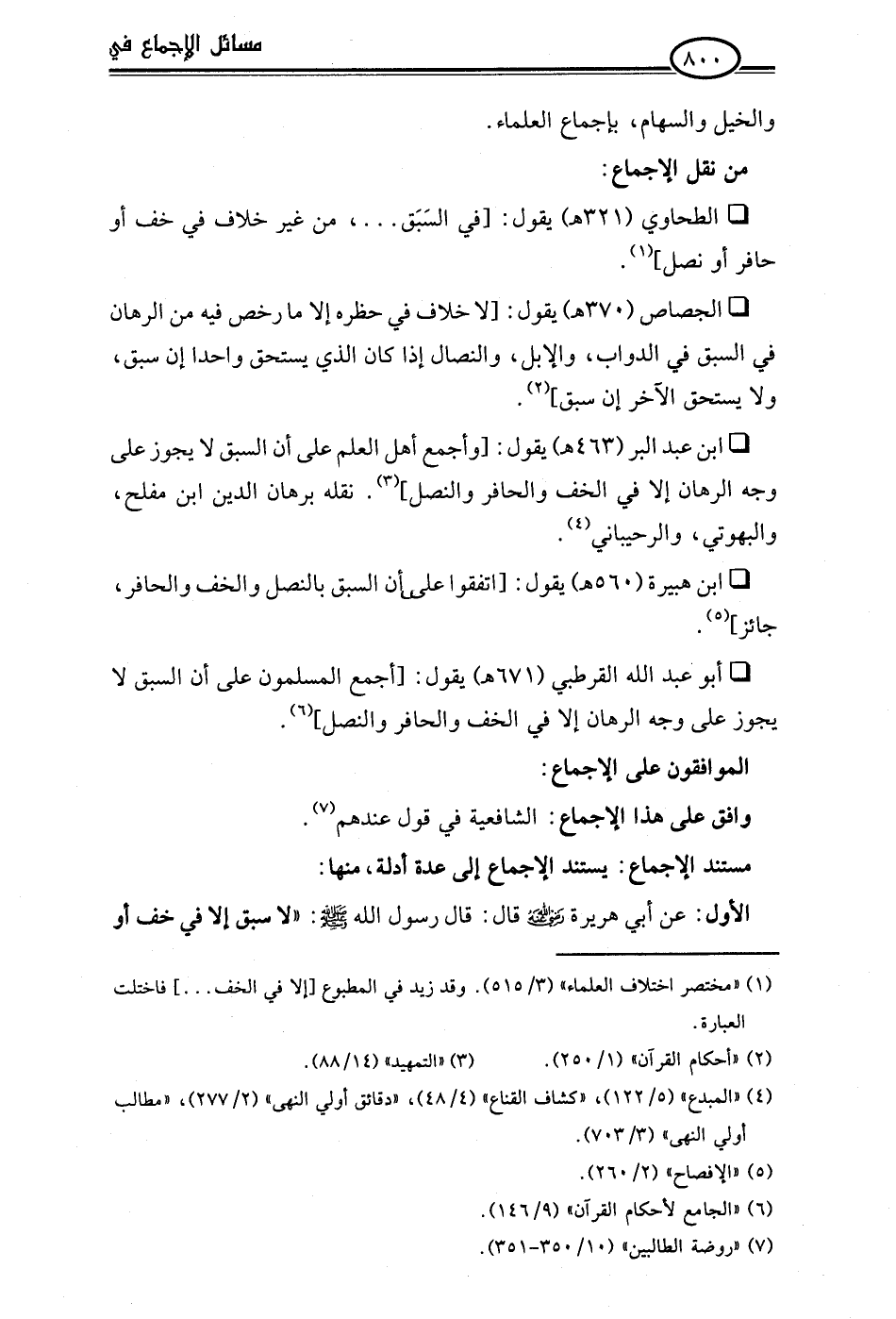• ابن عبد البر (463 هـ) يقول: [وأجمع أهل العلم على أن السبق لا يجوز على وجه الرهان إلا في الخف والحافر والنصل] (¬3). نقله برهان الدين ابن مفلح، والبهوتي، والرحيباني (¬4).