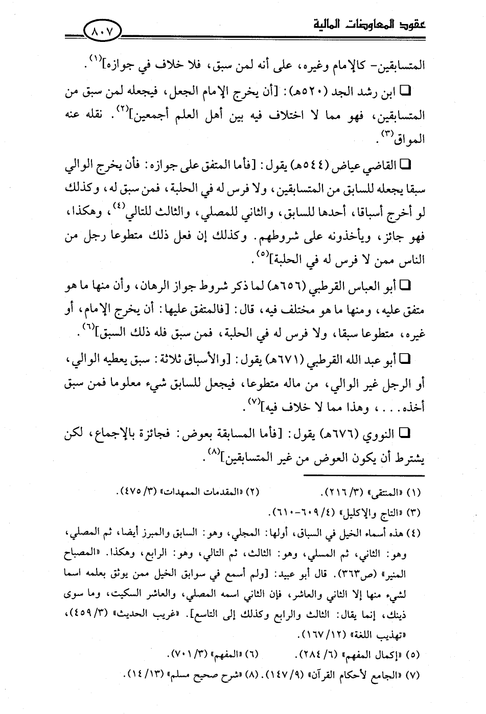 • النووي (676 هـ) يقول: [فأما المسابقة بعوض: فجائزة بالإجماع، لكن يشترط أن يكون العوض من غير المتسابقين] (¬8).
