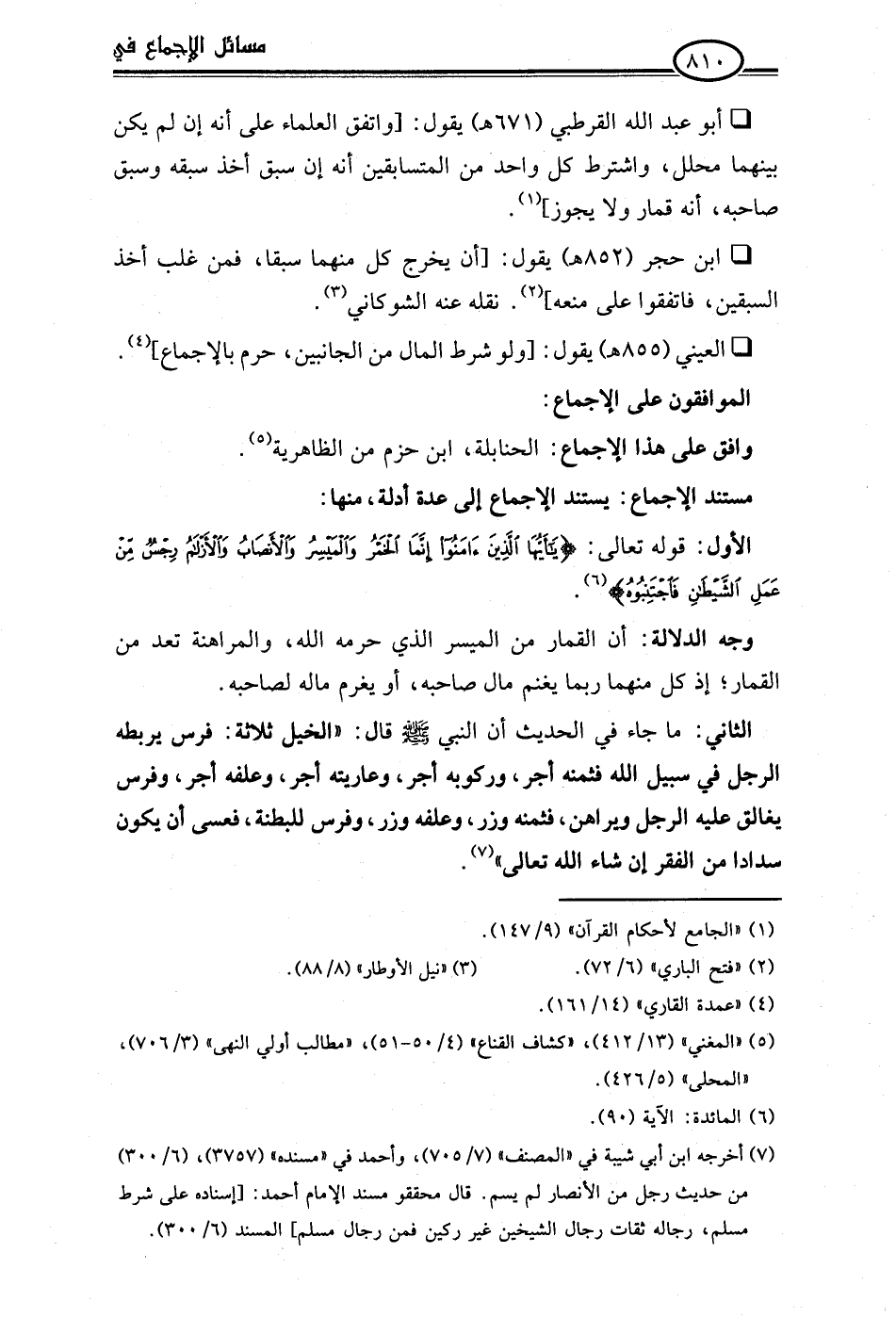 • أبو عبد اللَّه القرطبي (671 هـ) يقول: [واتفق العلماء على أنه إن لم يكن بينهما محلل، واشترط كل واحد من المتسابقين أنه إن سبق أخذ سبقه وسبق صاحبه، أنه قمار ولا يجوز] (¬1).