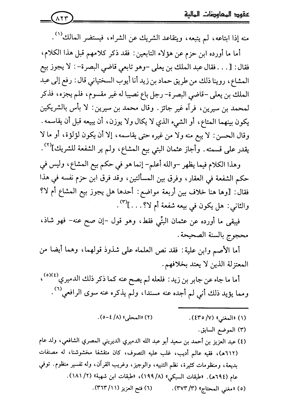 أما ما أورده ابن حزم عن هؤلاء التابعين: فقد ذكر كلامهم قبل هذا الكلام، فقال: [. . . فقال عبد الملك بن يعلى -وهو تابعي قاضي البصرة-: لا يجوز بيع المشاع، روينا ذلك من طريق حماد بن زيد أنا أيوب السختياني قال: رفع إلى عبد الملك بن يعلى -قاضي البصرة- رجل باع نصيبا له غير مقسوم، فلم يجزه، فذكر لمحمد بن سيرين، فرآه غير جائز. وقال محمد بن سيرين: لا بأس بالشريكين يكون بينهما المتاع، أو الشيء الذي لا يكال ولا يوزن، أن يبيعه قبل أن يقاسمه. وقال الحسن: لا يبع منه ولا من غيره حتى يقاسمه، إلا أن يكون لؤلؤة، أو ما لا يقدر على قسمته. وأجاز عثمان البتي بيع المشاع، ولم ير الشفعة للشريك] (¬2).