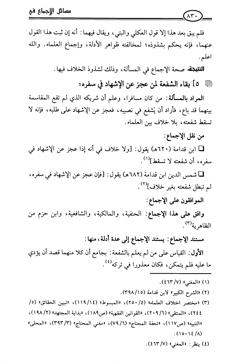 • ابن قدامة (620 هـ) يقول: [ولا خلاف في أنه إذا عجز عن الإشهاد في سفره، أن شفعته لا تسقط] (¬1).