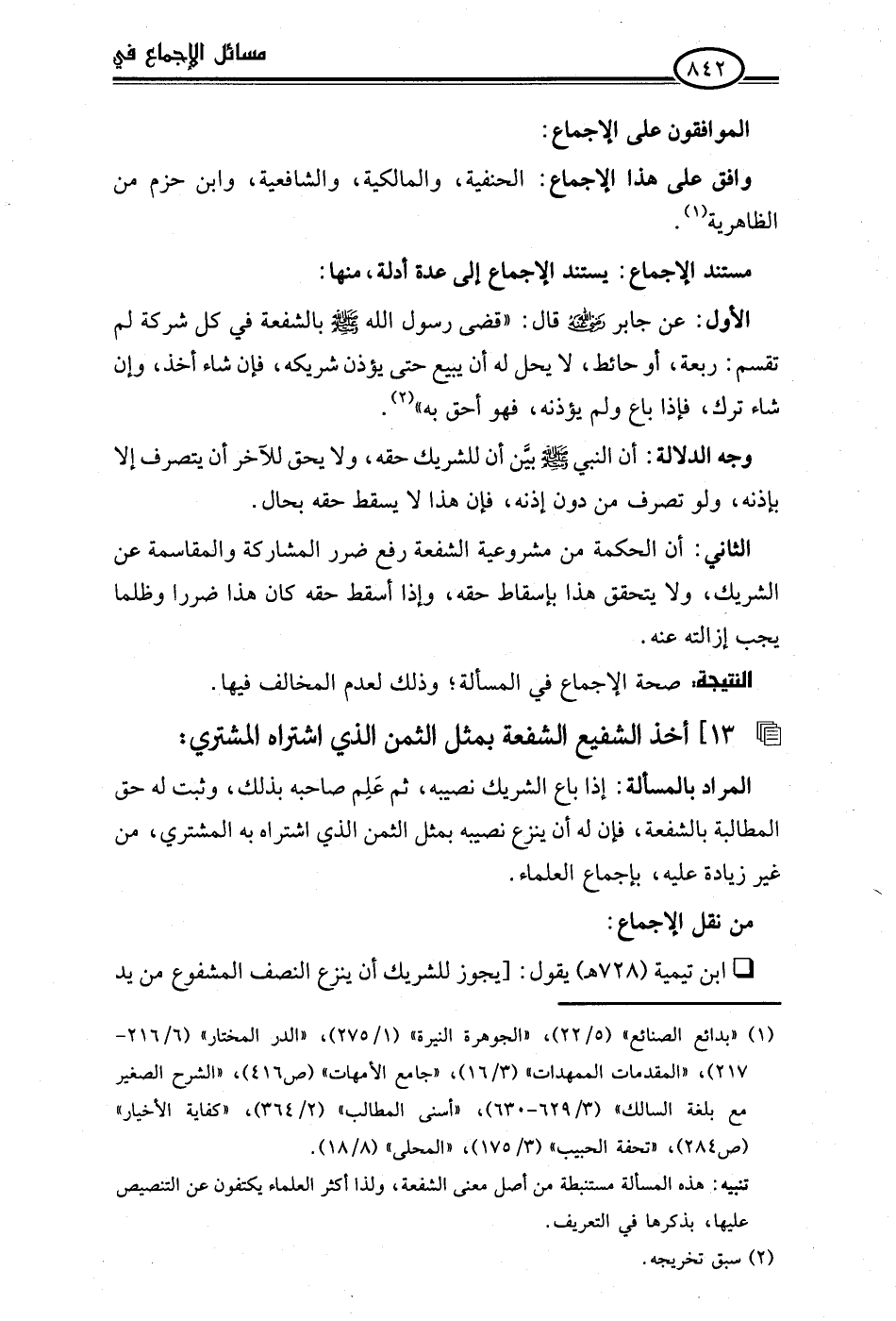 • ابن تيمية (728 هـ) يقول: [يجوز للشريك أن ينزع النصف المشفوع من يد