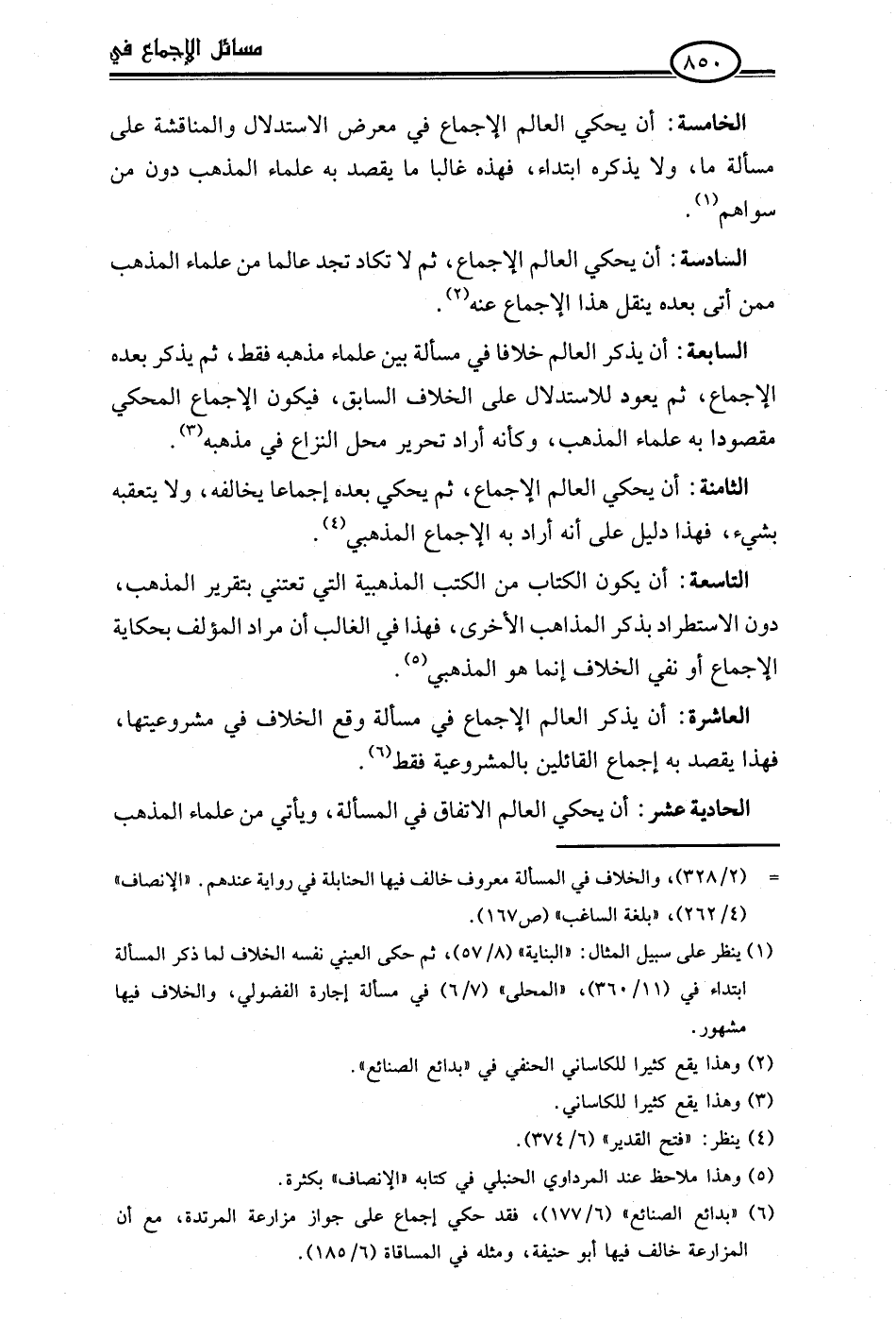 السابعة: أن يذكر العالم خلافا في مسألة بين علماء مذهبه فقط، ثم يذكر بعده الإجماع، ثم يعود للاستدلال على الخلاف السابق، فيكون الإجماع المحكي مقصودا به علماء المذهب، وكأنه أراد تحرير محل النزاع في مذهبه (¬3).
