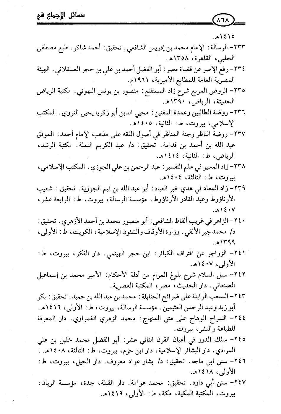 239 - زاد المعاد في هدي خير العباد: أبو عبد اللَّه بن قيم الجوزية. تحقيق: شعيب الأرناؤوط وعبد القادر الأرناؤوط. مؤسسة الرسالة، بيروت، ط: الرابعة عشر، 1407 هـ.