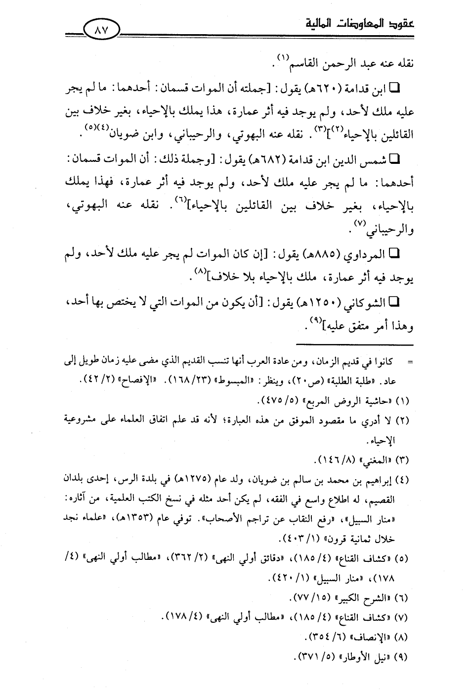 • ابن قدامة (620 هـ) يقول: [جملته أن الموات قسمان: أحدهما: ما لم يجر عليه ملك لأحد، ولم يوجد فيه أثر عمارة، هذا يملك بالإحياء، بغير خلاف بين القائلين بالإحياء (¬2)] (¬3). نقله عنه البهوتي، والرحيباني، وابن ضويان (¬4) (¬5).