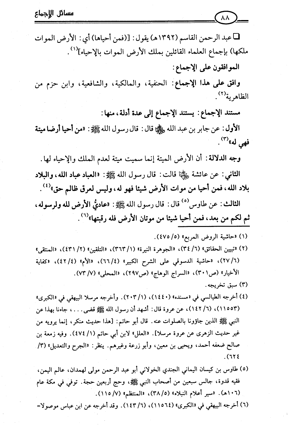 • عبد الرحمن القاسم (1392 هـ) يقول: [(فمن أحياها) أي: الأرض الموات ملكها) بإجماع العلماء القائلين بملك الأرض الموات بالإحياء] (¬1).