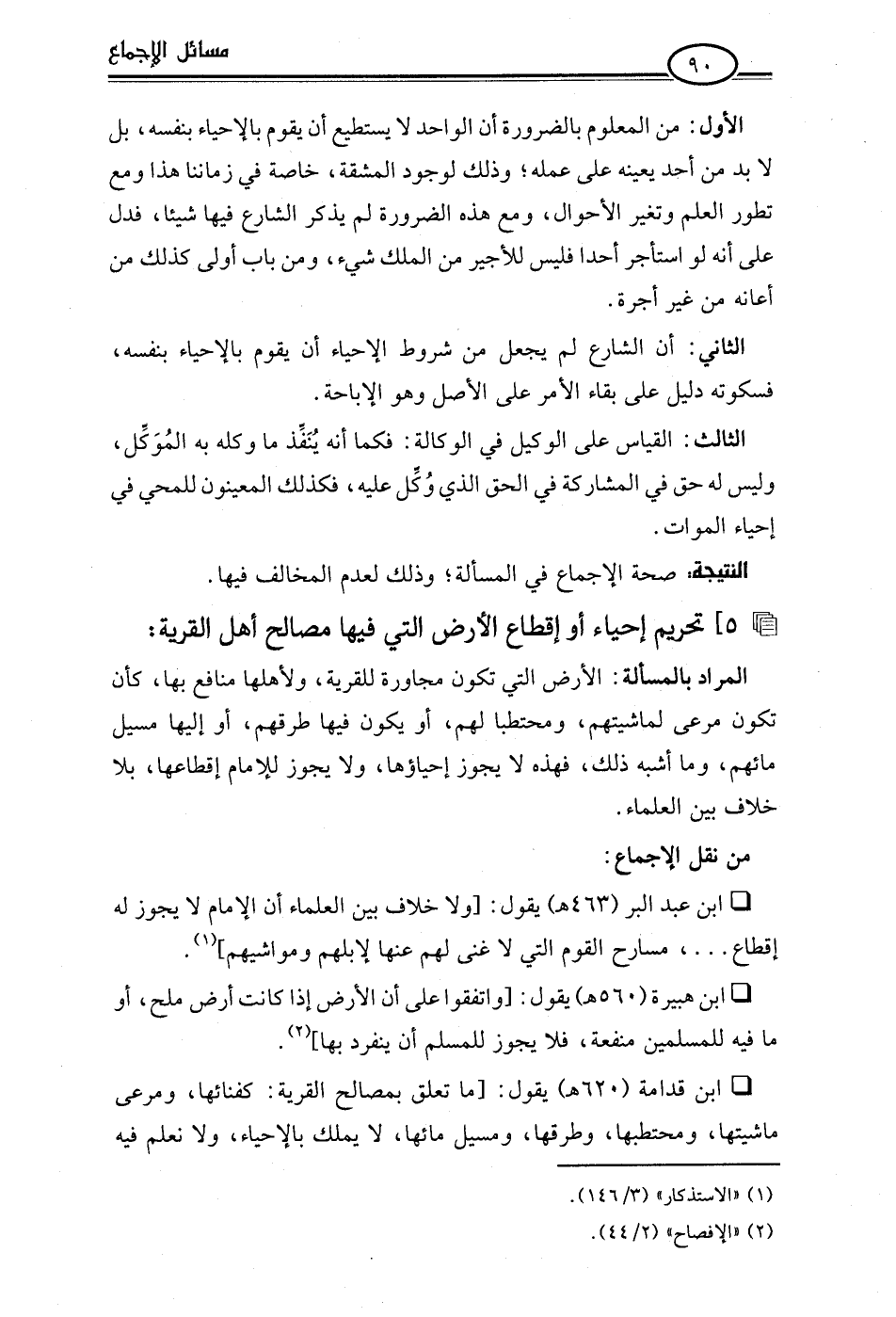 • ابن عبد البر (463 هـ) يقول: [ولا خلاف بين العلماء أن الإمام لا يجوز له إقطاع. . .، مسارح القوم التي لا غنى لهم عنها لإبلهم ومواشيهم] (¬1).