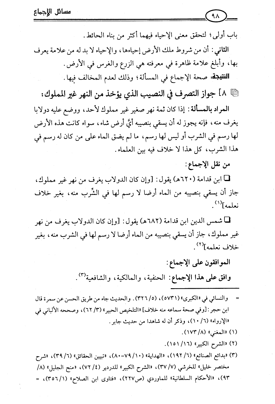 • ابن قدامة (620 هـ) يقول: [وإن كان الدولاب يغرف من نهر غير مملوك، جاز أن يسقي بنصيبه من الماء أرضا لا رسم لها في الشِّرب منه، بغير خلاف نعلمه] (¬1).