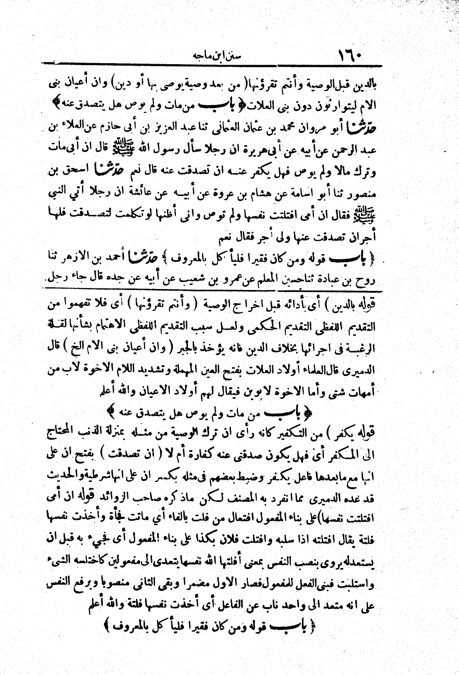 قَوْلُهُ: (يُكَفِّرُ) مِنَ التَّكْفِيرِ كَأَنَّهُ رَأَى أَنَّ تَرْكَ الْوَصِيَّةِ مِنْ مِثْلِهِ بِمَنْزِلَةِ الذَّنْبِ الْمُحْتَاجِ إِلَى الْمُكَفِّرِ، أَيْ: فَهَلْ يَكُونُ صَدَقَتِي عَنْهُ كَفَّارَةً أَمْ لَا (أَنْ تَصَدَّقْتُ) بِفَتْحِ أَنْ عَلَى أَنَّهَا مَعَ مَا بَعْدَهَا فَاعِلُ يُكَفِّرُ، وَضَبَطَ بَعْضُهُمْ فِي مِثْلِهِ بِكَسْرِ إِنْ عَلَى أَنَّهَا شَرْطِيَّةٌ. وَالْحَدِيثُ قَدْ عَدَّهُ الدَّمِيرِيُّ مِمَّا انْفَرَدَ بِهِ الْمُصَنِّفُ، لَكِنْ مَا ذَكَرَهُ صَاحِبُ الزَّوَائِدِ.