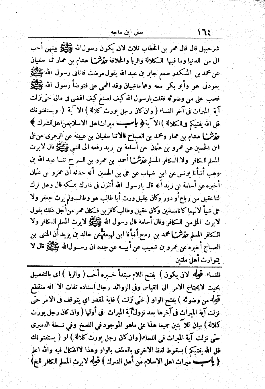 2728 - حَدَّثَنَا هِشَامُ بْنُ عَمَّارٍ حَدَّثَنَا سُفْيَانُ عَنْ مُحَمَّدِ بْنِ الْمُنْكَدِرِ سَمِعَ جَابِرَ بْنَ عَبْدِ اللَّهِ يَقُولُ «مَرِضْتُ فَأَتَانِي رَسُولُ اللَّهِ صَلَّى اللَّهُ عَلَيْهِ وَسَلَّمَ يَعُودُنِي هُوَ وَأَبُو بَكْرٍ مَعَهُ وَهُمَا مَاشِيَانِ وَقَدْ أُغْمِيَ عَلَيَّ فَتَوَضَّأَ رَسُولُ اللَّهِ صَلَّى اللَّهُ عَلَيْهِ وَسَلَّمَ فَصَبَّ عَلَيَّ مِنْ وَضُوئِهِ فَقُلْتُ يَا رَسُولَ اللَّهِ كَيْفَ أَصْنَعُ كَيْفَ أَقْضِي فِي مَالِي حَتَّى نَزَلَتْ آيَةُ الْمِيرَاثِ فِي آخِرِ النِّسَاءِ {وَإِنْ كَانَ رَجُلٌ يُورَثُ كَلَالَةً} [النساء: 12] وَ {يَسْتَفْتُونَكَ قُلْ اللَّهُ يُفْتِيكُمْ فِي الْكَلَالَةِ} [النساء: 176] الْآيَةَ»