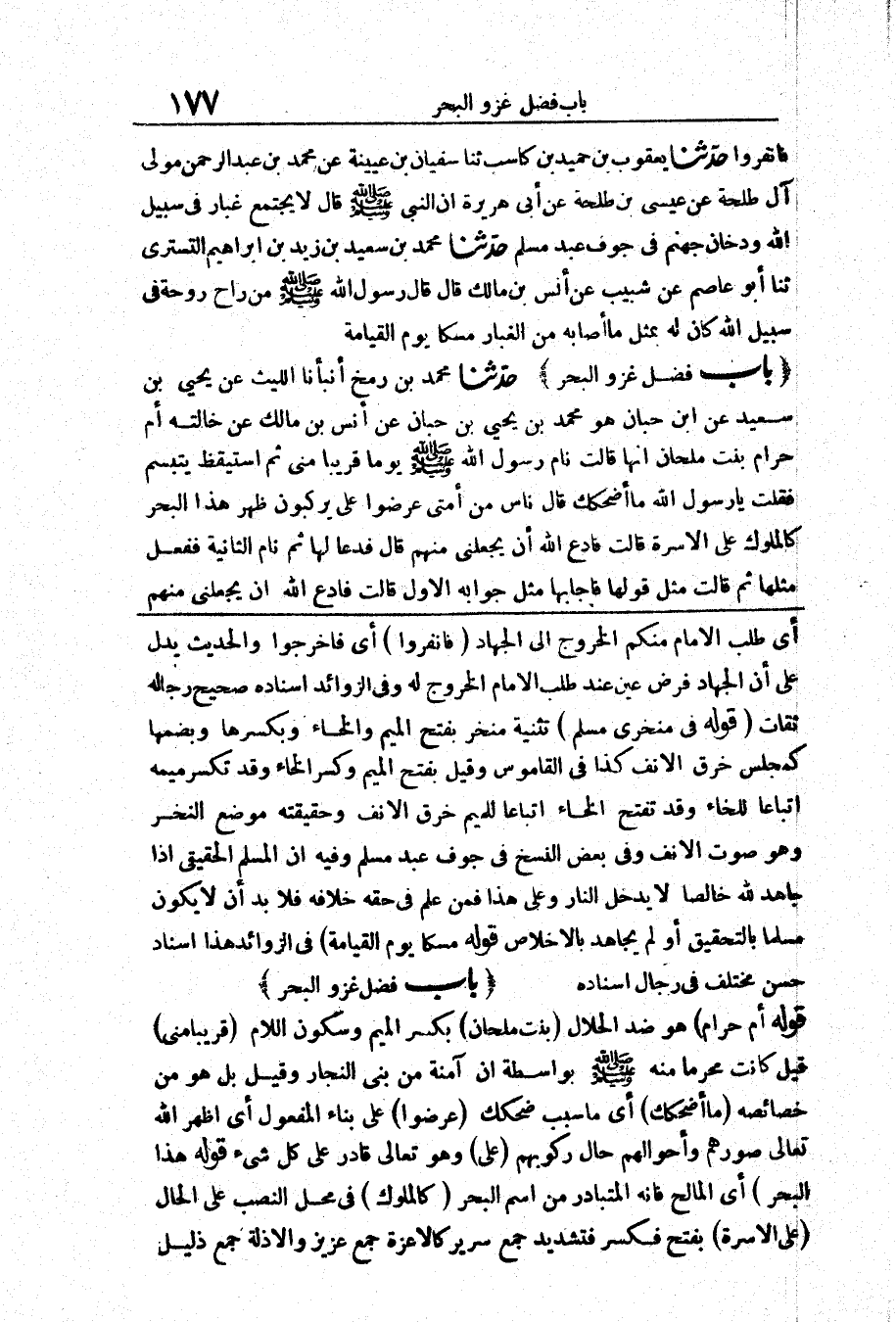 قَوْلُهُ: (أُمِّ حَرَامٍ) هُوَ ضِدُّ الْحَلَالِ (بِنْتِ مِلْحَانَ) بِكَسْرِ الْمِيمَ وَسُكُونَ اللَّامِ (قَرِيبًا مِنِّي) قِيلَ: كَانَتْ مَحْرَمًا مِنْهُ - صَلَّى اللَّهُ عَلَي هِ وَسَلَّمَ - بِوَاسِطَةِ أَنَّ آمِنَةَ مِنْ بَنِي النَّجَّارِ، وَقِيلَ: بَلْ هُوَ مِنْ خَصَائِصِهِ (مَا أَضْحَكَكَ) أَيْ: مَا سَبَبُ ضَحِكِكَ (عُرِضُوا) عَلَى بِنَاءِ الْمَفْعُولِ، أَيْ: أَظْهَرَ اللَّهُ تَعَالَى صُوَرَهُمْ وَأَحْوَالَهُمْ حَالَ رُكُوبِهِمْ (عَلَيَّ) وَهُوَ تَعَالَى قَادِرٌ عَلَى كُلِّ شَيْءٍ قَوْلُهُ: (هَذَا الْبَحْرِ) أَيِ: الْمَالِحِ فَإِنَّهُ الْمُتَبَادَرُ مِنِ اسْمِ الْبَحْرِ (كَالْمُلُوكِ) فِي مَحَلِّ النَّصْبِ عَلَى الْحَالِ (عَلَى الْأَسِرَّةِ) بِفَتْحٍ فَكَسْرٍ فَتَشْدِيدٍ: جَمْعُ سَرِيرٍ كَالْأَعِزَّةِ: جَمْعُ عَزِيزٍ، وَالْأَذِلَّةِ: جَمْعُ ذَلِيلٍ،