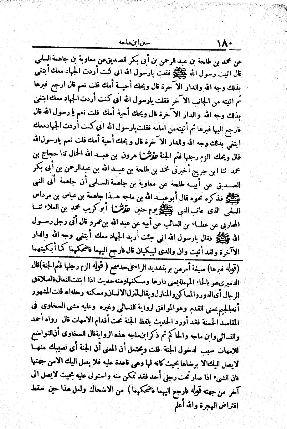 2781 - حَدَّثَنَا أَبُو يُوسُفَ مُحَمَّدُ بْنُ أَحْمَدَ الرَّقِّيُّ حَدَّثَنَا مُحَمَّدُ بْنُ سَلَمَةَ الْحَرَّانِيُّ عَنْ مُحَمَّدِ بْنِ إِسْحَقَ عَنْ مُحَمَّدِ بْنِ طَلْحَةَ بْنِ عَبْدِ الرَّحْمَنِ بْنِ أَبِي بَكْرٍ الصِّدِّيقِ عَنْ مُعَاوِيَةَ بْنِ جَاهِمَةَ السُّلَمِيِّ قَالَ «أَتَيْتُ رَسُولَ اللَّهِ صَلَّى اللَّهُ عَلَيْهِ وَسَلَّمَ فَقُلْتُ يَا رَسُولَ اللَّهِ إِنِّي كُنْتُ أَرَدْتُ الْجِهَادَ مَعَكَ أَبْتَغِي بِذَلِكَ وَجْهَ اللَّهِ وَالدَّارَ الْآخِرَةَ قَالَ وَيْحَكَ أَحَيَّةٌ أُمُّكَ قُلْتُ نَعَمْ قَالَ ارْجِعْ فَبَرَّهَا ثُمَّ أَتَيْتُهُ مِنْ الْجَانِبِ الْآخَرِ فَقُلْتُ يَا رَسُولَ اللَّهِ إِنِّي كُنْتُ أَرَدْتُ الْجِهَادَ مَعَكَ أَبْتَغِي بِذَلِكَ وَجْهَ اللَّهِ وَالدَّارَ الْآخِرَةَ قَالَ وَيْحَكَ أَحَيَّةٌ أُمُّكَ قُلْتُ نَعَمْ يَا رَسُولَ اللَّهِ قَالَ فَارْجِعْ إِلَيْهَا فَبَرَّهَا ثُمَّ أَتَيْتُهُ مِنْ أَمَامِهِ فَقُلْتُ يَا رَسُولَ اللَّهِ إِنِّي كُنْتُ أَرَدْتُ الْجِهَادَ مَعَكَ أَبْتَغِي بِذَلِكَ وَجْهَ اللَّهِ وَالدَّارَ الْآخِرَةَ قَالَ وَيْحَكَ أَحَيَّةٌ أُمُّكَ قُلْتُ نَعَمْ يَا رَسُولَ اللَّهِ قَالَ وَيْحَكَ الْزَمْ رِجْلَهَا فَثَمَّ الْجَنَّةُ» حَدَّثَنَا هَارُونُ بْنُ عَبْدِ اللَّهِ الْحَمَّالُ حَدَّثَنَا حَجَّاجُ بْنُ مُحَمَّدٍ حَدَّثَنَا ابْنُ جُرَيْجٍ أَخْبَرَنِي مُحَمَّدُ بْنُ طَلْحَةَ بْنِ عَبْدِ اللَّهِ بْنِ عَبْدِ الرَّحْمَنِ بْنِ أَبِي بَكْرٍ الصِّدِّيقِ عَنْ أَبِيهِ طَلْحَةَ عَنْ مُعَاوِيَةَ بْنِ جَاهِمَةَ السُّلَمِيِّ أَنَّ جَاهِمَةَ أَتَى النَّبِيَّ صَلَّى اللَّهُ عَلَيْهِ وَسَلَّمَ فَذَكَرَ نَحْوَهُ قَالَ أَبُو عَبْد اللَّهِ بْن مَاجَةَ هَذَا جَاهِمَةُ بْنُ عَبَّاسِ بْنِ مِرْدَاسٍ السُّلَمِيُّ الَّذِي عَاتَبَ النَّبِيَّ صَلَّى اللَّهُ عَلَيْهِ وَسَلَّمَ يَوْمَ حُنَيْنٍ