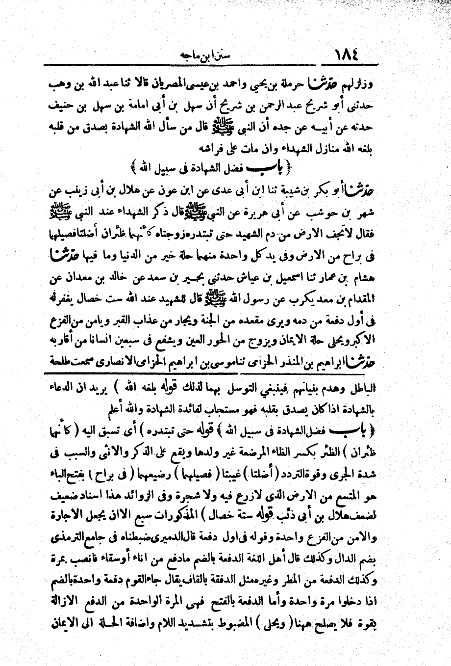 2797 - حَدَّثَنَا حَرْمَلَةُ بْنُ يَحْيَى وَأَحْمَدُ بْنُ عِيسَى الْمِصْرِيَّانِ قَالَا حَدَّثَنَا عَبْدُ اللَّهِ بْنُ وَهْبٍ حَدَّثَنِي أَبُو شُرَيْحٍ عَبْدُ الرَّحْمَنِ بْنُ شُرَيْحٍ أَنَّ سَهْلَ بْنَ أَبِي أُمَامَةَ بْنِ سَهْلِ بْنِ حُنَيْفٍ حَدَّثَهُ عَنْ أَبِيهِ عَنْ جَدِّهِ «أَنَّ النَّبِيَّ صَلَّى اللَّهُ عَلَيْهِ وَسَلَّمَ قَالَ مَنْ سَأَلَ اللَّهَ الشَّهَادَةَ بِصِدْقٍ مِنْ قَلْبِهِ بَلَّغَهُ اللَّهُ مَنَازِلَ الشُّهَدَاءِ وَإِنْ مَاتَ عَلَى فِرَاشِهِ»