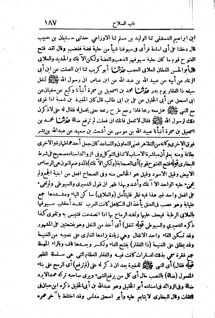 2807 - حَدَّثَنَا عَبْدُ الرَّحْمَنِ بْنُ إِبْرَاهِيمَ الدِّمَشْقِيُّ حَدَّثَنَا الْوَلِيدُ بْنُ مُسْلِمٍ حَدَّثَنَا الْأَوْزَاعِيُّ حَدَّثَنِي سُلَيْمَانُ بْنُ حَبِيبٍ قَالَ دَخَلْنَا عَلَى أَبِي أُمَامَةَ فَرَأَى فِي سُيُوفِنَا شَيْئًا مِنْ حِلْيَةِ فِضَّةٍ فَغَضِبَ وَقَالَ لَقَدْ فَتَحَ الْفُتُوحَ قَوْمٌ مَا كَانَ حِلْيَةُ سُيُوفِهِمْ مِنْ الذَّهَبِ وَالْفِضَّةِ وَلَكِنْ الْآنُكُ وَالْحَدِيدُ وَالْعَلَابِيُّ قَالَ أَبُو الْحَسَنِ الْقَطَّانُ الْعَلَابِيُّ الْعَصَبُ