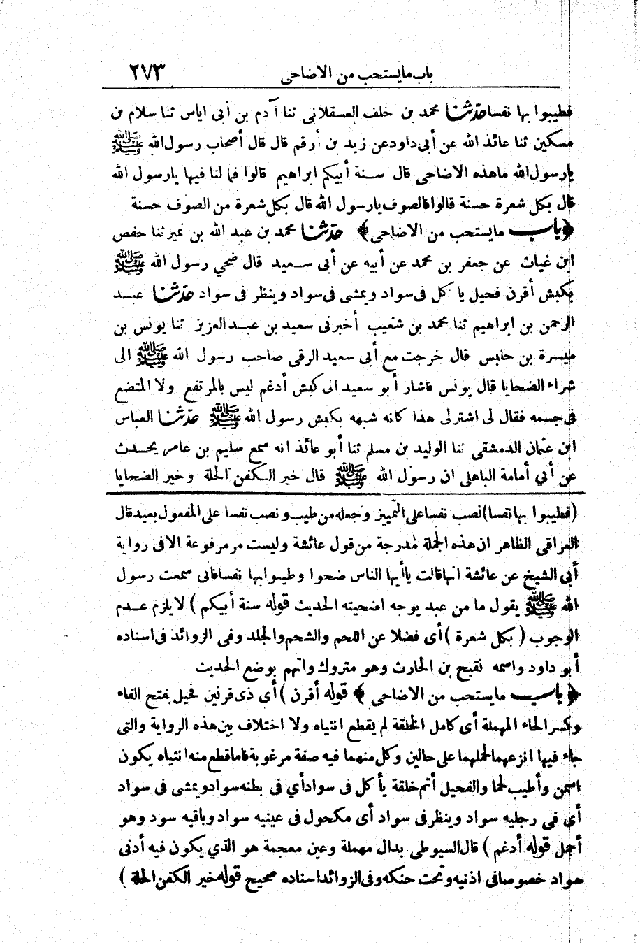 3128 - حَدَّثَنَا مُحَمَّدُ بْنُ عَبْدِ اللَّهِ بْنِ نُمَيْرٍ حَدَّثَنَا حَفْصُ بْنُ غِيَاثٍ عَنْ جَعْفَرِ بْنِ مُحَمَّدٍ عَنْ أَبِيهِ عَنْ أَبِي سَعِيدٍ قَالَ «ضَحَّى رَسُولُ اللَّهِ صَلَّى اللَّهُ عَلَيْهِ وَسَلَّمَ بِكَبْشٍ أَقْرَنَ فَحِيلٍ يَأْكُلُ فِي سَوَادٍ وَيَمْشِي فِي سَوَادٍ وَيَنْظُرُ فِي سَوَادٍ»