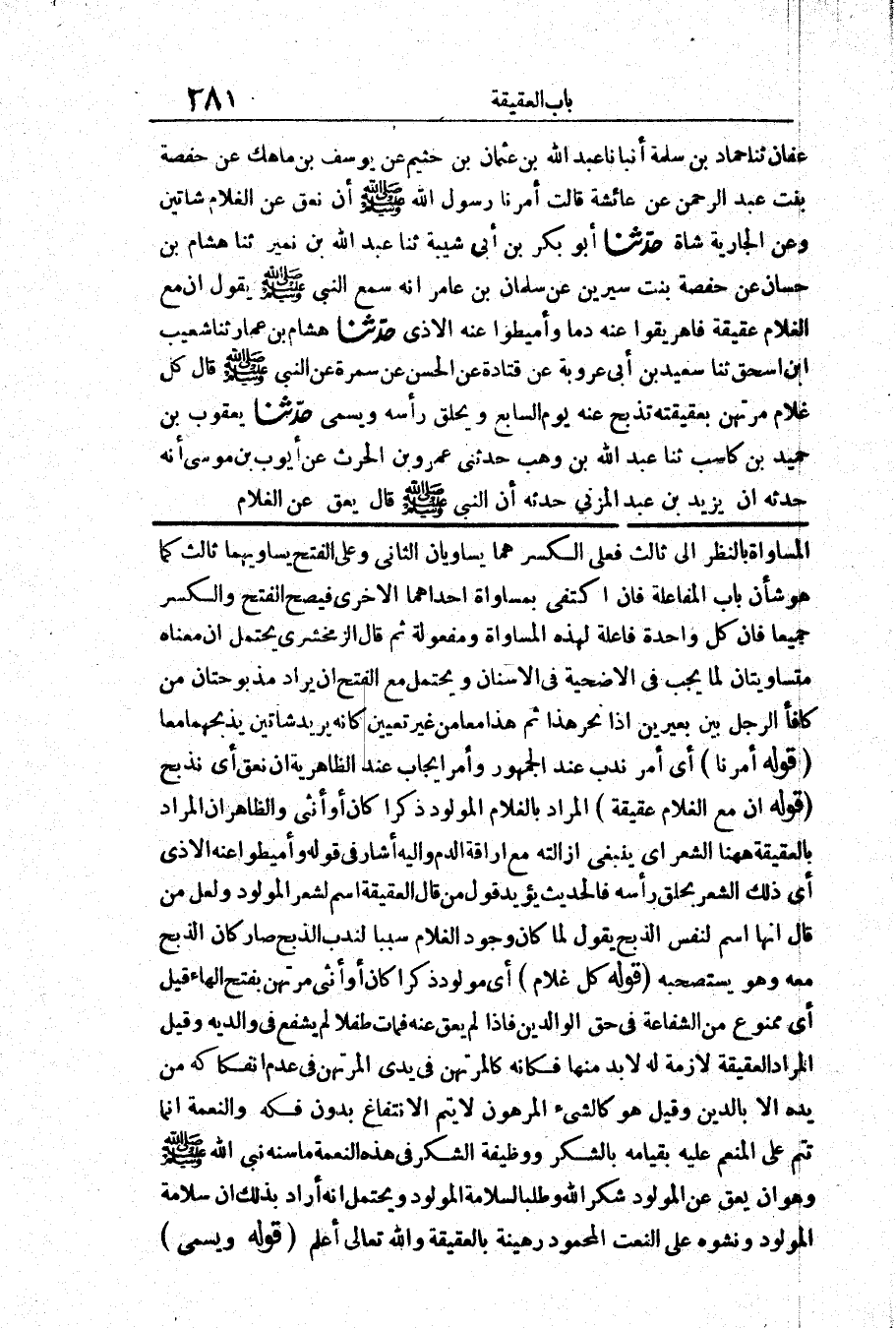 قَوْلُهُ: (إِنَّ مَعَ الْغُلَامِ عَقِيقَةً) الْمُرَادُ بِالْغُلَامِ الْمَوْلُودُ ذَكَرًا كَانَ أَوْ أُنْثَى، وَالظَّاهِرُ أَنَّ الْمُرَادَ بِالْعَقِيقَةِ هَاهُنَا الشَّعْرُ، أَيْ: يَنْبَغِي إِزَالَتُهُ مَعَ إِرَاقَةِ الدَّمِ وَإِلَيْهِ أَشَارَ فِي قَوْلِهِ: «وَأَمِيطُوا عَنْهُ الْأَذَى،» أَيْ: ذَلِكَ الشَّعْرَ بِحَلْقِ رَأْسِهِ، فَالْحَدِيثُ يُؤَيِّدُ قَوْلَ مَنْ قَالَ: الْعَقِيقَةُ اسْمٌ لِشَعْرِ الْمَوْلُودِ، وَلَعَلَّ مَنْ قَالَ إِنَّهَا اسْمٌ لِنَفْسِ الذَّبْحِ يَقُولُ لَمَّا كَانَ وُجُودُ الْغُلَامِ سَبَبًا لِنَدْبِ الذَّبْحِ صَارَ كَأَنَّ الذَّبْحَ مَعَهُ وَهُوَ يَسْتَصْحِبُهُ.