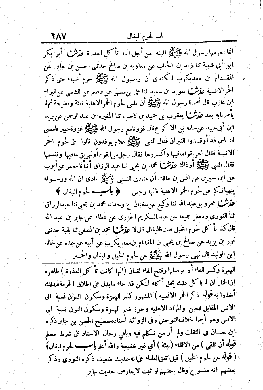 قَوْلُهُ: (عَنْ لُحُومِ الْخَيْلِ) قِيلَ: اتَّفَقَ الْعُلَمَاءُ عَلَى أَنَّهُ حَدِيثٌ ضَعِيفٌ ذَكَرَهُ النَّوَوِيُّ وَذَكَرَ بَعْضُهُمْ أَنَّهُ مَنْسُوخٌ وَقَالَ بَعْضُهُمْ لَوْ ثَبَتَ لَا يُعَارِضُ حَدِيثَ جَابِرٍ.