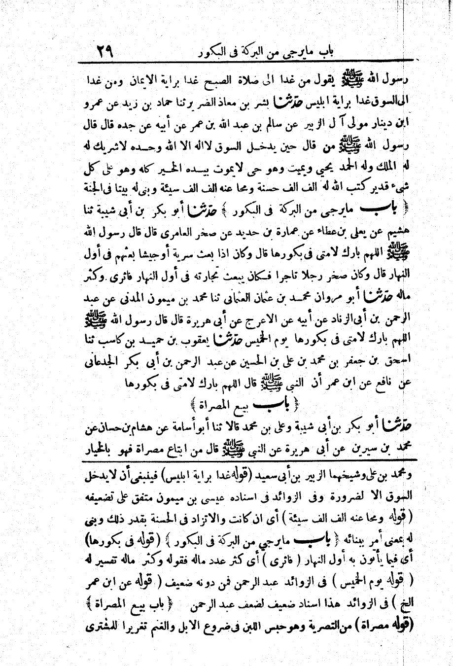 2236 - حَدَّثَنَا أَبُو بَكْرِ بْنُ أَبِي شَيْبَةَ حَدَّثَنَا هُشَيْمٌ عَنْ يَعْلَى بْنِ عَطَاءٍ عَنْ عُمَارَةَ بْنِ حَدِيدٍ عَنْ صَخْرٍ الْغَامِدِيِّ قَالَ «قَالَ رَسُولُ اللَّهِ صَلَّى اللَّهُ عَلَيْهِ وَسَلَّمَ اللَّهُمَّ بَارِكْ لِأُمَّتِي فِي بُكُورِهَا قَالَ وَكَانَ إِذَا بَعَثَ سَرِيَّةً أَوْ جَيْشًا بَعَثَهُمْ فِي أَوَّلِ النَّهَارِ قَالَ وَكَانَ صَخْرٌ رَجُلًا تَاجِرًا فَكَانَ يَبْعَثُ تِجَارَتَهُ فِي أَوَّلِ النَّهَارِ فَأَثْرَى وَكَثُرَ مَالُهُ»