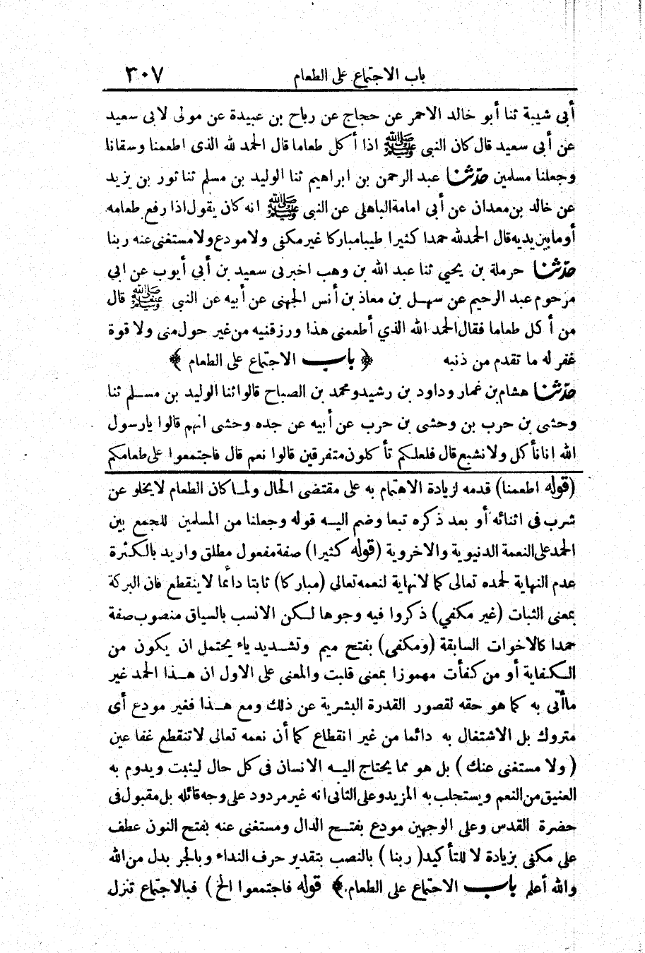 قَوْلُهُ: (أَطْعَمَنَا) قَدَّمَهُ لِزِيَادَةِ الِاهْتِمَامِ بِهِ عَلَى مُقْتَضَى الْحَالِ وَلِمَا كَانَ الطَّعَامُ لَا يَخْلُو عَنْ شُرْبٍ فِي أَثْنَائِهِ أَوْ بَعْدُ، ذَكَرَهُ تَبَعًا وَضَمَّ إِلَيْهِ قَوْلَهُ: وَجَعَلَنَا مِنَ الْمُسْلِمِينَ لِلْجَمْعِ بَيْنَ الْحَمْدِ عَلَى النِّعْمَةِ الدُّنْيَوِيَّةِ وَالْأُخْرَوِيَّةِ.