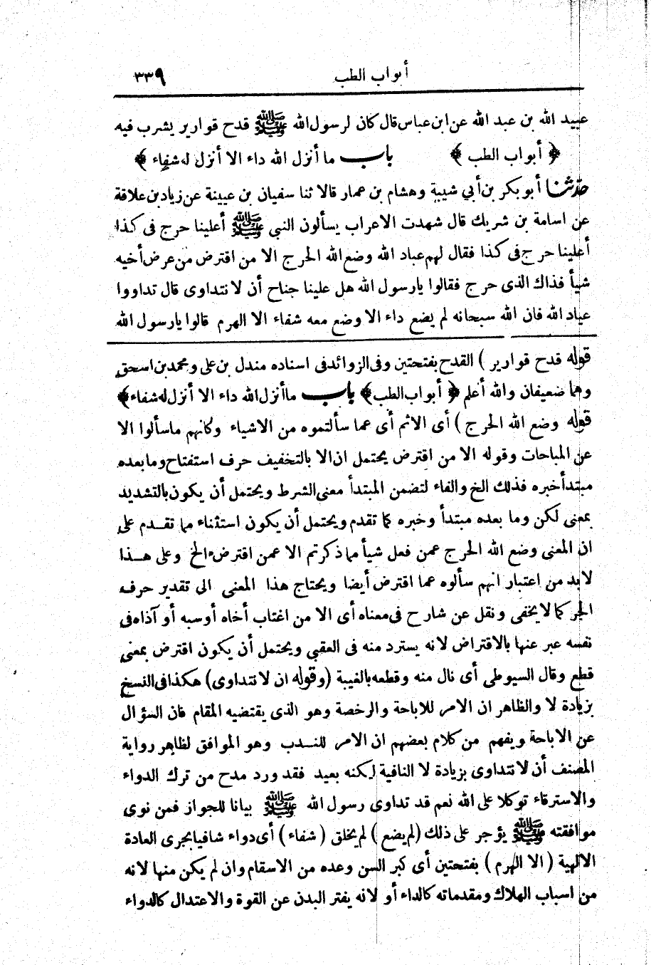 3436 - حَدَّثَنَا أَبُو بَكْرِ بْنُ أَبِي شَيْبَةَ وَهِشَامُ بْنُ عَمَّارٍ قَالَا حَدَّثَنَا سُفْيَانُ بْنُ عُيَيْنَةَ عَنْ زِيَادِ بْنِ عِلَاقَةَ عَنْ أُسَامَةَ بْنِ شَرِيكٍ قَالَ «شَهِدْتُ الْأَعْرَابَ يَسْأَلُونَ النَّبِيَّ صَلَّى اللَّهُ عَلَيْهِ وَسَلَّمَ أَعَلَيْنَا حَرَجٌ فِي كَذَا أَعَلَيْنَا حَرَجٌ فِي كَذَا فَقَالَ لَهُمْ عِبَادَ اللَّهِ وَضَعَ اللَّهُ الْحَرَجَ إِلَّا مَنْ اقْتَرَضَ مِنْ عِرْضِ أَخِيهِ شَيْئًا فَذَاكَ الَّذِي حَرِجَ فَقَالُوا يَا رَسُولَ اللَّهِ هَلْ عَلَيْنَا جُنَاحٌ أَنْ لَا نَتَدَاوَى قَالَ تَدَاوَوْا عِبَادَ اللَّهِ فَإِنَّ اللَّهَ سُبْحَانَهُ لَمْ يَضَعْ دَاءً إِلَّا وَضَعَ مَعَهُ شِفَاءً إِلَّا الْهَرَمَ قَالُوا يَا رَسُولَ اللَّهِ مَا خَيْرُ مَا أُعْطِيَ الْعَبْدُ قَالَ خُلُقٌ حَسَنٌ»