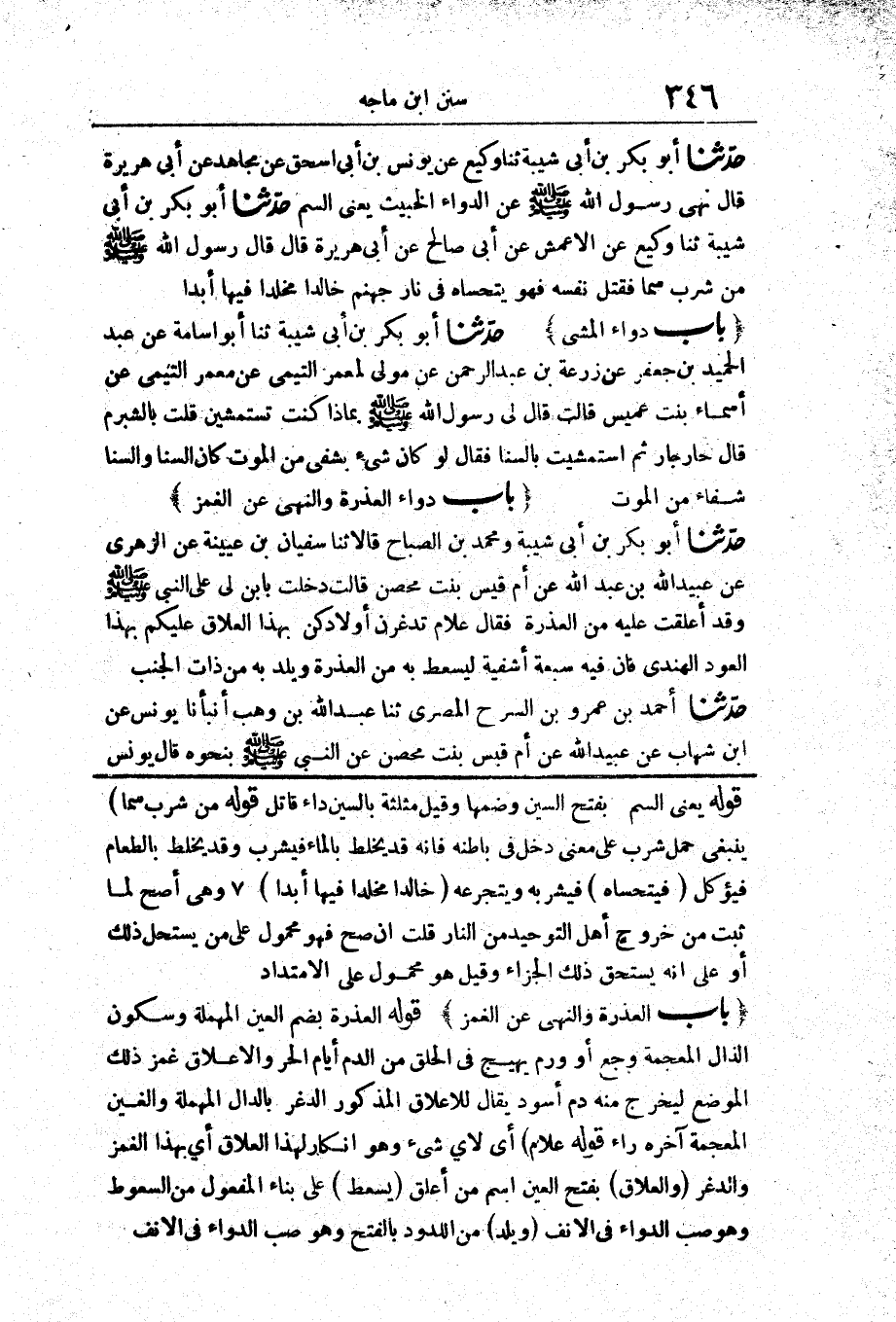3462 - حَدَّثَنَا أَبُو بَكْرِ بْنُ أَبِي شَيْبَةَ وَمُحَمَّدُ بْنُ الصَّبَّاحِ قَالَا حَدَّثَنَا سُفْيَانُ بْنُ عُيَيْنَةَ عَنْ الزُّهْرِيِّ عَنْ عُبَيْدِ اللَّهِ بْنِ عَبْدِ اللَّهِ عَنْ أُمِّ قَيْسٍ بِنْتِ مِحْصَنٍ قَالَتْ «دَخَلْتُ بِابْنٍ لِي عَلَى النَّبِيِّ صَلَّى اللَّهُ عَلَيْهِ وَسَلَّمَ وَقَدْ أَعْلَقْتُ عَلَيْهِ مِنْ الْعُذْرَةِ فَقَالَ عَلَامَ تَدْغَرْنَ أَوْلَادَكُنَّ بِهَذَا الْعِلَاقِ عَلَيْكُمْ بِهَذَا الْعُودِ الْهِنْدِيِّ فَإِنَّ فِيهِ سَبْعَةَ أَشْفِيَةٍ يُسْعَطُ بِهِ مِنْ الْعُذْرَةِ وَيُلَدُّ بِهِ مِنْ ذَاتِ الْجَنْبِ» حَدَّثَنَا أَحْمَدُ بْنُ عَمْرِو بْنِ السَّرْحِ الْمِصْرِيُّ حَدَّثَنَا عَبْدُ اللَّهِ بْنُ وَهْبٍ أَنْبَأَنَا يُونُسُ عَنْ ابْنِ شِهَابٍ عَنْ عُبَيْدِ اللَّهِ عَنْ أُمِّ قَيْسٍ بِنْتِ مِحْصَنٍ عَنْ النَّبِيِّ صَلَّى اللَّهُ عَلَيْهِ وَسَلَّمَ بِنَحْوِهِ قَالَ يُونُسُ أَعْلَقْتُ يَعْنِي غَمَزْتُ