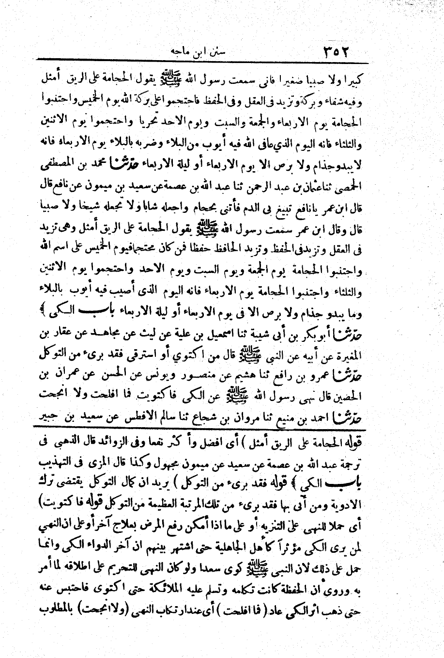 3488 - حَدَّثَنَا مُحَمَّدُ بْنُ الْمُصَفَّى الْحِمْصِيُّ حَدَّثَنَا عُثْمَانُ بْنُ عَبْدِ الرَّحْمَنِ حَدَّثَنَا عَبْدُ اللَّهِ بْنُ عِصْمَةَ عَنْ سَعِيدِ بْنِ مَيْمُونٍ عَنْ نَافِعٍ قَالَ قَالَ ابْنُ عُمَرَ «يَا نَافِعُ تَبَيَّغَ بِيَ الدَّمُ فَأْتِنِي بِحَجَّامٍ وَاجْعَلْهُ شَابًّا وَلَا تَجْعَلْهُ شَيْخًا وَلَا صَبِيًّا قَالَ وَقَالَ ابْنُ عُمَرَ سَمِعْتُ رَسُولَ اللَّهِ صَلَّى اللَّهُ عَلَيْهِ وَسَلَّمَ يَقُولُ الْحِجَامَةُ عَلَى الرِّيقِ أَمْثَلُ وَهِيَ تَزِيدُ فِي الْعَقْلِ وَتَزِيدُ فِي الْحِفْظِ وَتَزِيدُ الْحَافِظَ حِفْظًا فَمَنْ كَانَ مُحْتَجِمًا فَيَوْمَ الْخَمِيسِ عَلَى اسْمِ اللَّهِ وَاجْتَنِبُوا الْحِجَامَةَ يَوْمَ الْجُمُعَةِ وَيَوْمَ السَّبْتِ وَيَوْمَ الْأَحَدِ وَاحْتَجِمُوا يَوْمَ الِاثْنَيْنِ وَالثُّلَاثَاءِ وَاجْتَنِبُوا الْحِجَامَةَ يَوْمَ الْأَرْبِعَاءِ فَإِنَّهُ الْيَوْمُ الَّذِي أُصِيبَ فِيهِ أَيُّوبُ بِالْبَلَاءِ وَمَا يَبْدُو جُذَامٌ وَلَا بَرَصٌ إِلَّا فِي يَوْمِ الْأَرْبِعَاءِ أَوْ لَيْلَةِ الْأَرْبِعَاءِ»