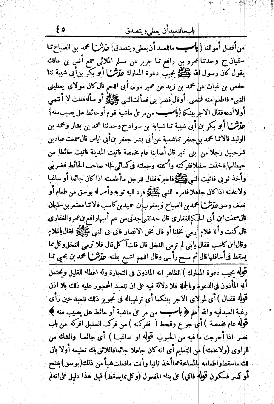 قَوْلُهُ: (يُجِيبُ دَعْوَةَ الْمَمْلُوكِ) الظَّاهِرُ أَنَّهُ الْمَأْذُونُ فِي التِّجَارَةِ وَلَهُ إِعْطَاءُ الْقَلِيلِ وَيُحْتَمَلُ أَنَّهُ الْمَأْذُونُ فِي الدَّعْوَةِ، وَبِالْجُمْلَةِ فَلَا دَلَالَةَ فِيهِ عَلَى أَنَّ لِلْعَبْدِ الْمَحْجُورِ عَلَيْهِ ذَلِكَ بِلَا إِذْنٍ.