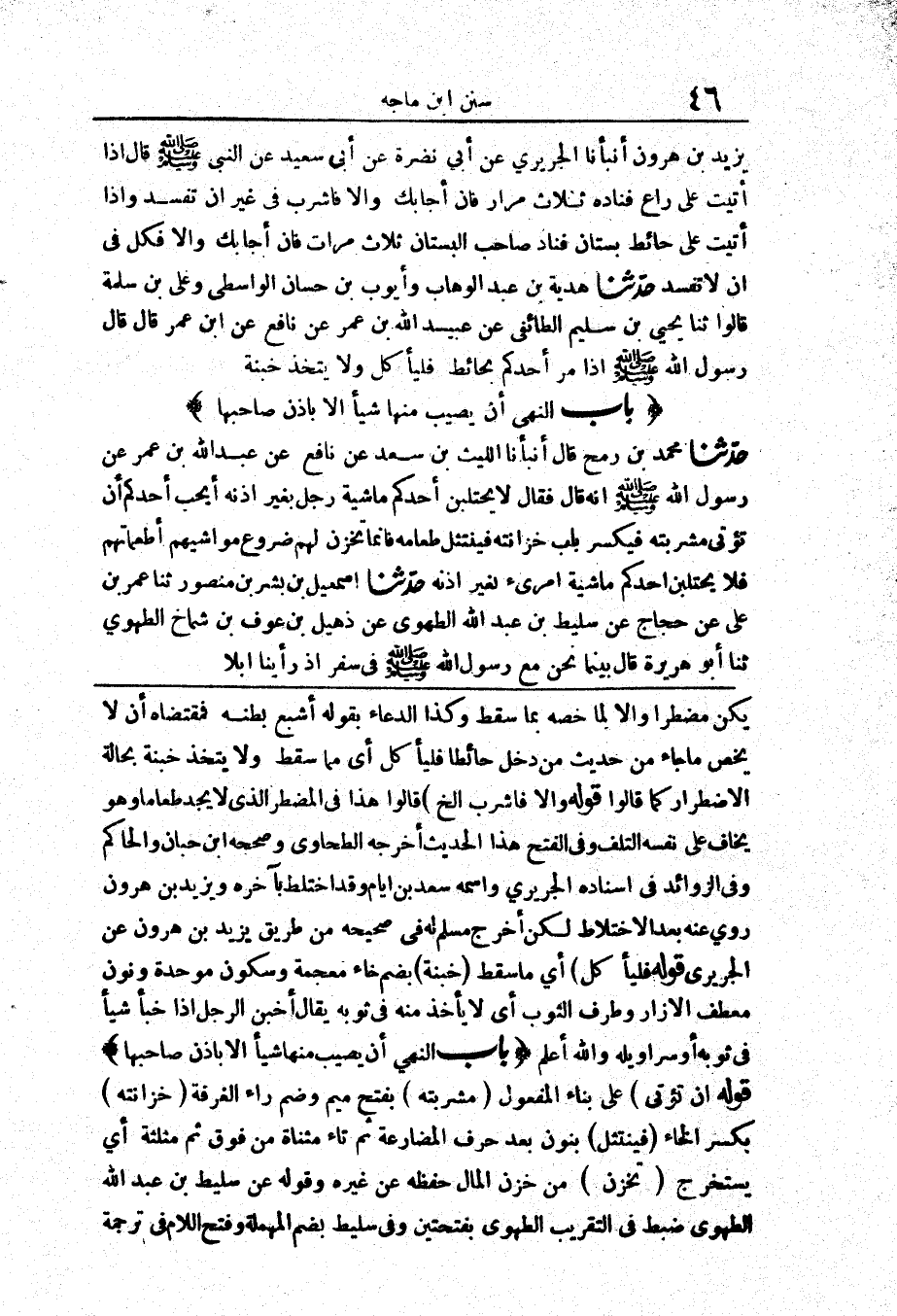 2301 - حَدَّثَنَا هَدِيَّةُ بْنُ عَبْدِ الْوَهَّابِ وَأَيُّوبُ بْنُ حَسَّانَ الْوَاسِطِيُّ وَعَلِيُّ بْنُ سَلَمَةَ قَالُوا حَدَّثَنَا يَحْيَى بْنُ سُلَيْمٍ الطَّائِفِيُّ عَنْ عُبَيْدِ اللَّهِ بْنِ عُمَرَ عَنْ نَافِعٍ عَنْ ابْنِ عُمَرَ قَالَ «قَالَ رَسُولُ اللَّهِ صَلَّى اللَّهُ عَلَيْهِ وَسَلَّمَ إِذَا مَرَّ أَحَدُكُمْ بِحَائِطٍ فَلْيَأْكُلْ وَلَا يَتَّخِذْ خُبْنَةً»