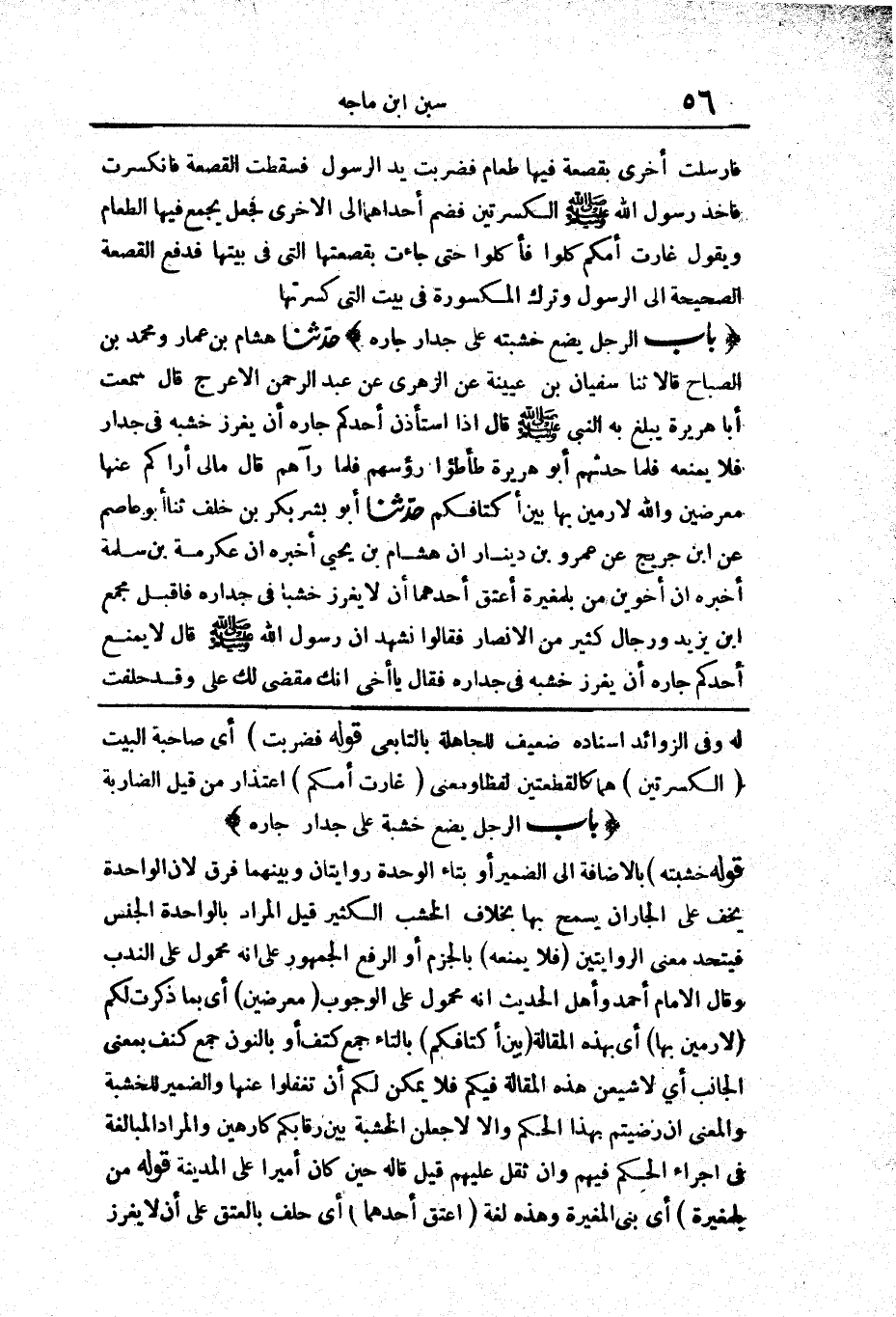 قَوْلُهُ: (خَشَبَتُهُ) بِالْإِضَافَةِ إِلَى الضَّمِيرِ، أَوْ بِتَاءِ الْوَحْدَةِ رِوَايَتَانِ وَبَيْنَهُمَا فَرْقٌ؛ لِأَنَّ الْوَاحِدَةَ يَخِفُّ عَلَى الْجَارِ أَنْ يَسْمَحَ بِهَا بِخِلَافِ الْخَشَبِ الْكَثِيرِ، قِيلَ: الْمُرَادُ بِالْوَاحِدَةِ الْجِنْسُ فَيَتَّحِدُ مَعْنَى الرِّوَايَتَيْنِ (فَلَا يَمْنَعْهُ) بِالْجَزْمِ أَوِ الرَّفْعِ، الْجُمْهُورُ عَلَى أَنَّهُ مَحْمُولٌ عَلَى النَّدْبِ. وَقَالَ الْإِمَامُ أَحْمَدُ وَأَهْلُ الْحَدِيثِ: إِنَّهُ مَحْمُولٌ عَلَى الْوُجُوبِ (مُعْرِضِينَ) أَيْ: بِمَا ذَكَرْتُ لَكُمْ (لَأَرْمِيَنَّ بِهَا) أَيْ: بِهَذِهِ الْمَقَالَةِ (بَيْنَ أَكْتَافِكُمْ) بِالتَّاءِ جَمْعُ كَتِفٍ، أَوْ بِالنُّونِ جَمْعِ كَنَفٍ بِمَعْنَى الْجَانِبِ، أَيْ: لَأُشِيعَنَّ هَذِهِ الْمَقَالَةَ فِيكُمْ فَلَا يُمْكِنُ لَكُمْ أَنْ تَغْفُلُوا عَنْهَا، وَالضَّمِيرُ لِلْخَشَبَةِ، وَالْمَعْنَى إِنْ رَضِيتُمْ بِهَذَا الْحُكْمِ وَإِلَّا لَأَجْعَلَنَّ الْخَشَبَةَ بَيْنَ رِقَابِكُمْ كَارِهِينَ، وَالْمُرَادُ الْمُبَالَغَةُ فِي إِجْرَاءِ الْحُكْمِ فِيهِمْ وَإِنْ ثَقُلَ عَلَيْهِمْ قِيلَ: قَالَهُ حِينَ كَانَ أَمِيرًا عَلَى الْمَدِينَةِ.