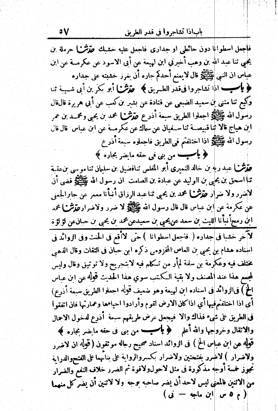 قَوْلُهُ: (أَنْ لَا ضَرَرَ وَلَا ضِرَارَ) لَا ضَرَرَ بِفَتْحَتَيْنِ وَلَا ضِرَارَ بِكَسْرٍ وَالرِّوَايَةُ عَلَى بِنَائِهِمَا عَلَى الْفَتْحِ، وَالدِّرَايَةُ تُجَوِّزُ خَمْسَةَ أَوْجُهٍ مَذْكُورَةٍ فِي مِثْلِ لَا حَوْلَ وَلَا قُوَّةَ، ثُمَّ الضَّرَرُ خِلَافَ النَّفْعِ وَالضِّرَارُ مِنَ الِاثْنَيْنِ فَالْمَعْنَى: لَيْسَ لِأَحَدٍ أَنْ يَضُرَّ صَاحِبَهُ بِوَجْهٍ وَلَا لِاثْنَيْنِ أَنْ يَضُرَّ كُلٌّ مِنْهُمَا
