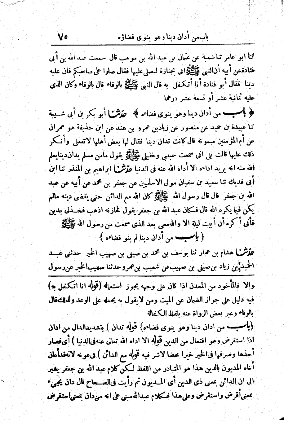 2407 - حَدَّثَنَا مُحَمَّدُ بْنُ بَشَّارٍ حَدَّثَنَا أَبُو عَامِرٍ حَدَّثَنَا شُعْبَةُ عَنْ عُثْمَانَ بْنِ عَبْدِ اللَّهِ بْنِ مَوْهَبٍ قَالَ سَمِعْتُ عَبْدَ اللَّهِ بْنَ أَبِي قَتَادَةَ عَنْ أَبِيهِ «أَنَّ النَّبِيَّ صَلَّى اللَّهُ عَلَيْهِ وَسَلَّمَ أُتِيَ بِجَنَازَةٍ لِيُصَلِّيَ عَلَيْهَا فَقَالَ صَلُّوا عَلَى صَاحِبِكُمْ فَإِنَّ عَلَيْهِ دَيْنًا فَقَالَ أَبُو قَتَادَةَ أَنَا أَتَكَفَّلُ بِهِ قَالَ النَّبِيُّ صَلَّى اللَّهُ عَلَيْهِ وَسَلَّمَ بِالْوَفَاءِ قَالَ بِالْوَفَاءِ وَكَانَ الَّذِي عَلَيْهِ ثَمَانِيَةَ عَشَرَ أَوْ تِسْعَةَ عَشَرَ دِرْهَمًا»