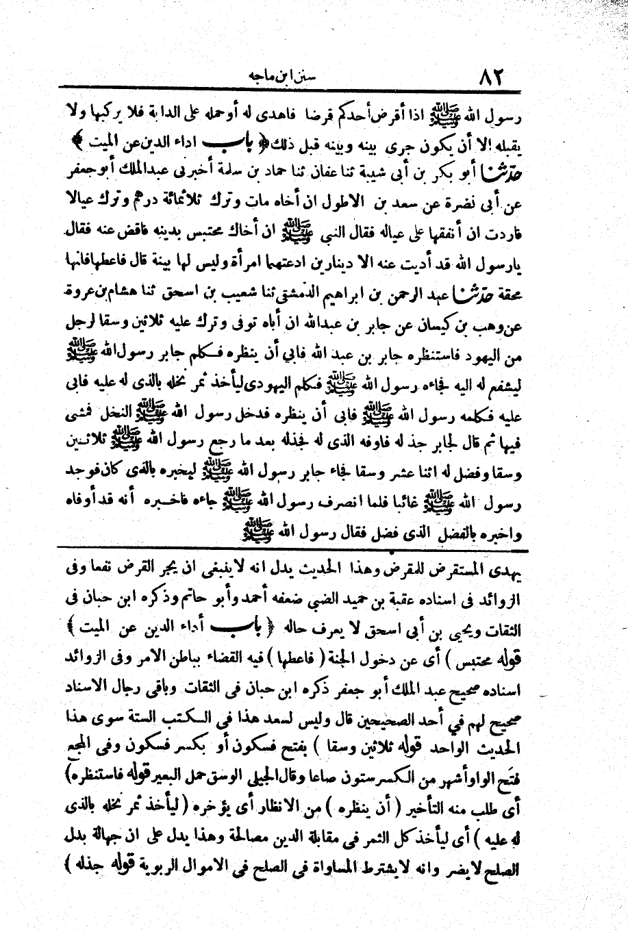 2434 - حَدَّثَنَا عَبْدُ الرَّحْمَنِ بْنُ إِبْرَاهِيمَ الدِّمَشْقِيُّ حَدَّثَنَا شُعَيْبُ بْنُ إِسْحَقَ حَدَّثَنَا هِشَامُ بْنُ عُرْوَةَ عَنْ وَهْبِ بْنِ كَيْسَانَ عَنْ جَابِرِ بْنِ عَبْدِ اللَّهِ «أَنَّ أَبَاهُ تُوُفِّيَ وَتَرَكَ عَلَيْهِ ثَلَاثِينَ وَسْقًا لِرَجُلٍ مِنْ الْيَهُودِ فَاسْتَنْظَرَهُ جَابِرُ بْنُ عَبْدِ اللَّهِ فَأَبَى أَنْ يُنْظِرَهُ فَكَلَّمَ جَابِرٌ رَسُولَ اللَّهِ صَلَّى اللَّهُ عَلَيْهِ وَسَلَّمَ لِيَشْفَعَ لَهُ إِلَيْهِ فَجَاءَهُ رَسُولُ اللَّهِ صَلَّى اللَّهُ عَلَيْهِ وَسَلَّمَ فَكَلَّمَ الْيَهُودِيَّ لِيَأْخُذَ ثَمَرَ نَخْلِهِ بِالَّذِي لَهُ عَلَيْهِ فَأَبَى عَلَيْهِ فَكَلَّمَهُ رَسُولُ اللَّهِ صَلَّى اللَّهُ عَلَيْهِ وَسَلَّمَ فَأَبَى أَنْ يُنْظِرَهُ فَدَخَلَ رَسُولُ اللَّهِ صَلَّى اللَّهُ عَلَيْهِ وَسَلَّمَ النَّخْلَ فَمَشَى فِيهَا ثُمَّ قَالَ لِجَابِرٍ جُدَّ لَهُ فَأَوْفِهِ الَّذِي لَهُ فَجَدَّ لَهُ بَعْدَ مَا رَجَعَ رَسُولُ اللَّهِ صَلَّى اللَّهُ عَلَيْهِ وَسَلَّمَ ثَلَاثِينَ وَسْقًا وَفَضَلَ لَهُ اثْنَا عَشَرَ وَسْقًا فَجَاءَ جَابِرٌ رَسُولَ اللَّهِ صَلَّى اللَّهُ عَلَيْهِ وَسَلَّمَ لِيُخْبِرَهُ بِالَّذِي كَانَ فَوَجَدَ رَسُولَ اللَّهِ صَلَّى اللَّهُ عَلَيْهِ وَسَلَّمَ غَائِبًا فَلَمَّا انْصَرَفَ رَسُولُ اللَّهِ صَلَّى اللَّهُ عَلَيْهِ وَسَلَّمَ جَاءَهُ فَأَخْبَرَهُ أَنَّهُ قَدْ أَوْفَاهُ وَأَخْبَرَهُ بِالْفَضْلِ الَّذِي فَضَلَ فَقَالَ رَسُولُ اللَّهِ صَلَّى اللَّهُ عَلَيْهِ وَسَلَّمَ أَخْبِرْ بِذَلِكَ عُمَرَ بْنَ الْخَطَّابِ فَذَهَبَ جَابِرٌ إِلَى عُمَرَ فَأَخْبَرَهُ فَقَالَ لَهُ عُمَرُ لَقَدْ عَلِمْتُ حِينَ مَشَى فِيهِ رَسُولُ اللَّهِ صَلَّى اللَّهُ عَلَيْهِ وَسَلَّمَ لَيُبَارِكَنَّ اللَّهُ فِيهَا»