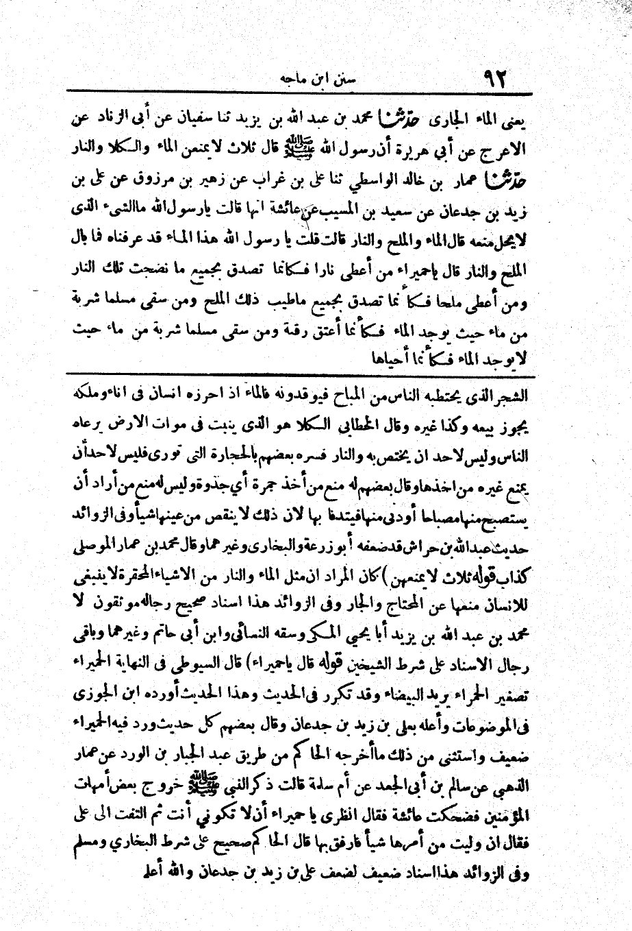 2473 - حَدَّثَنَا مُحَمَّدُ بْنُ عَبْدِ اللَّهِ بْنِ يَزِيدَ حَدَّثَنَا سُفْيَانُ عَنْ أَبِي الزِّنَادِ عَنْ الْأَعْرَجِ عَنْ أَبِي هُرَيْرَةَ «أَنَّ رَسُولَ اللَّهِ صَلَّى اللَّهُ عَلَيْهِ وَسَلَّمَ قَالَ ثَلَاثٌ لَا يُمْنَعْنَ الْمَاءُ وَالْكَلَأُ وَالنَّارُ»